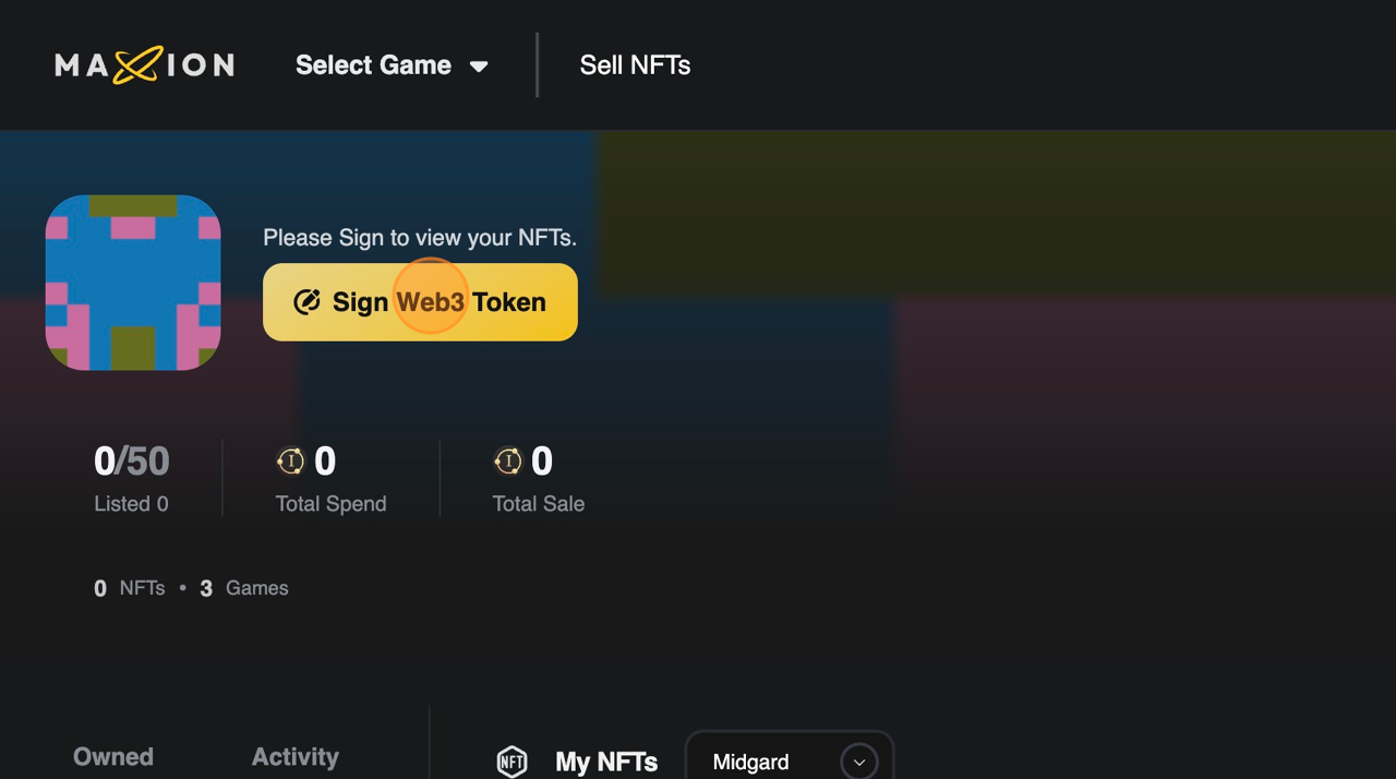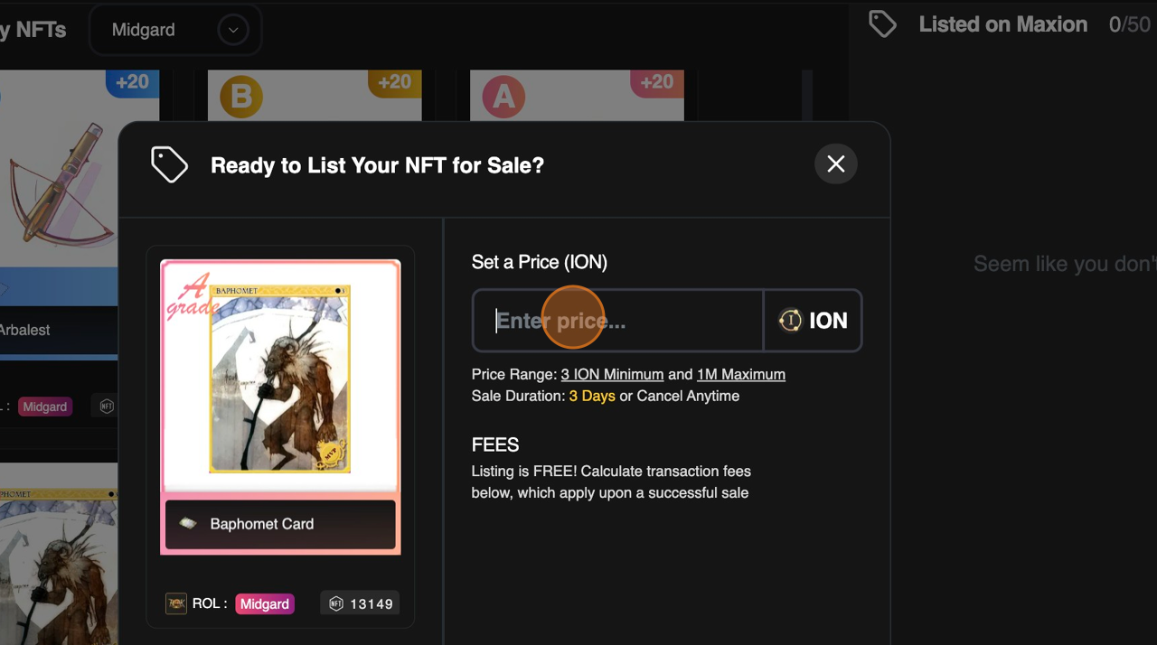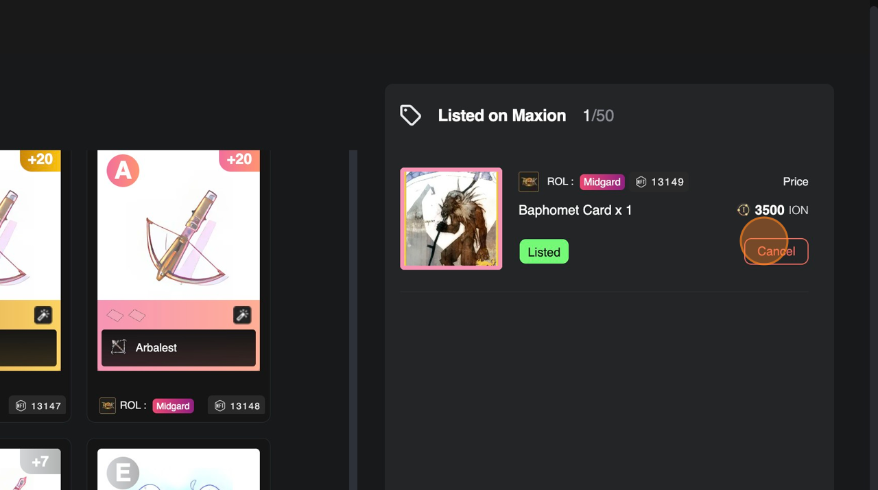 * O item listado aparecerá na seção \[Listed on Maxion] no Inventário do Marketplace, e o seu NFT será exibido no marketplace após um tempo de espera de 5 minutos.