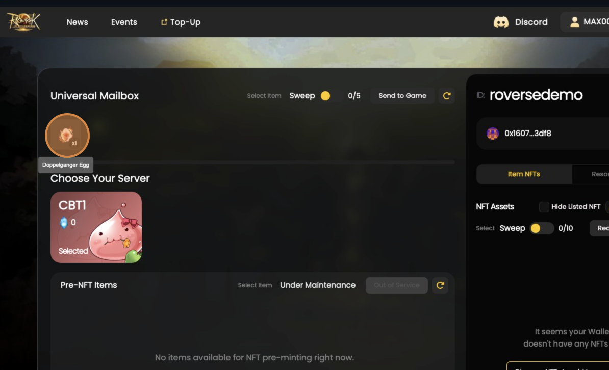 * Após alguns minutos do resgate bem-sucedido do NFT, o item deverá aparecer na seção Universal Mailbox. Clique no \[ícone do item] para enviar o item para o jogo. Caso você não veja seus itens, clique no botão "Atualizar" para atualizar e buscar novamente o item na Universal Mailbox.