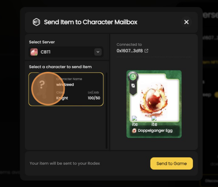 * Selecione o \[Servidor] e o \[Personagem] para o qual deseja enviar o item.