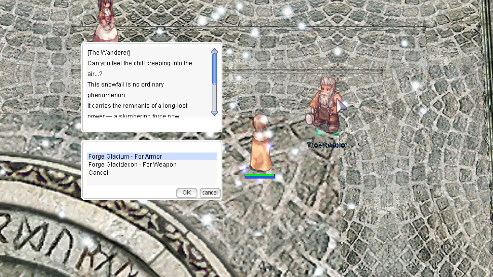 Amidst the chilling winds, adventurers encounter a mysterious man known only as The Wanderer. He reveals that this snowfall is no ordinary weather — it carries traces of ancient energy, hidden within the icy crystals.