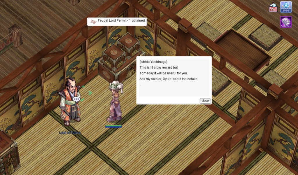 Once the wolf spirit leaves her body, you will receive a Nine Tail. Then, return to Ishida in the castle. You will be given the Feudal Lord Permit, which grants you access to any area in the city.