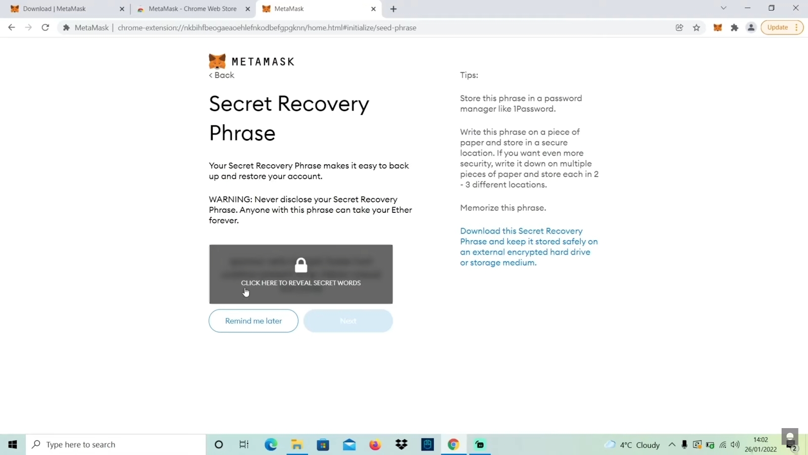 คุณจะได้รับข้อความ seed phrase ซึ่งเป็นชุดคำที่ประกอบด้วย 12 คำสุ่ม ซึ่งคุณสามารถใช้ชุดคำเหล่านี้เพื่อกู้คืนกระเป๋าเงินของคุณในกรณีที่คุณลืมรหัสผ่านหรือสูญเสียอุปกรณ์ของคุณได้ จงเขียน seed phrase นี้ลงบนกระดาษและเก็บไว้ในที่ปลอดภัย