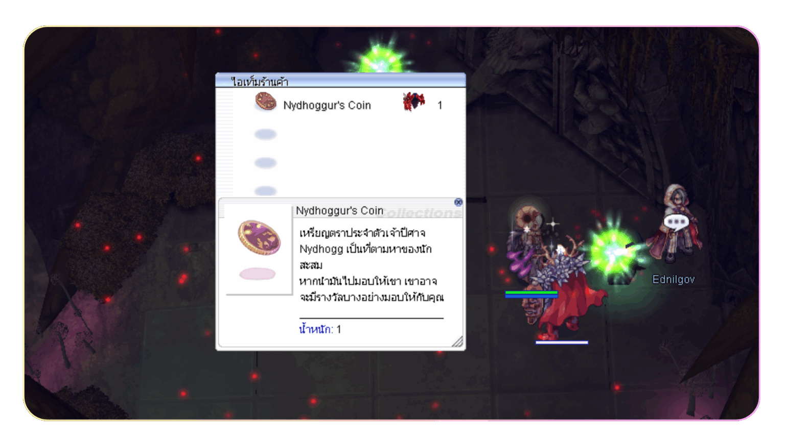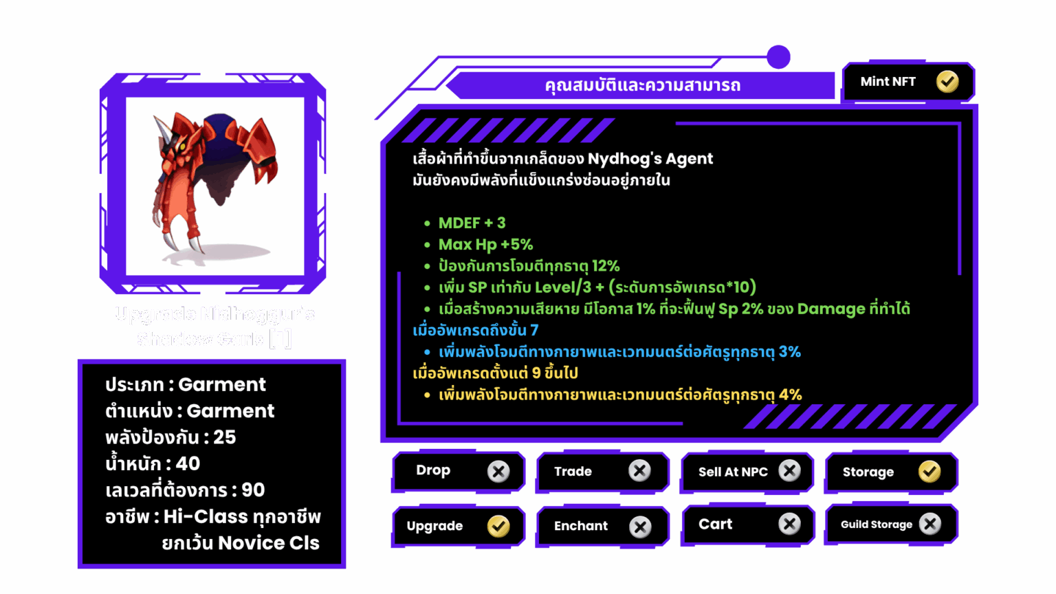 ย่อยมัฟมังกรแดง : สามารถนำมัฟ Nidhoggur’s Shadow Garb [1] 1 ชิ้น ไปแลกเป็น Nidhoggur’s Coin เพื่อใช้สำหรับการอัปเกรดได้