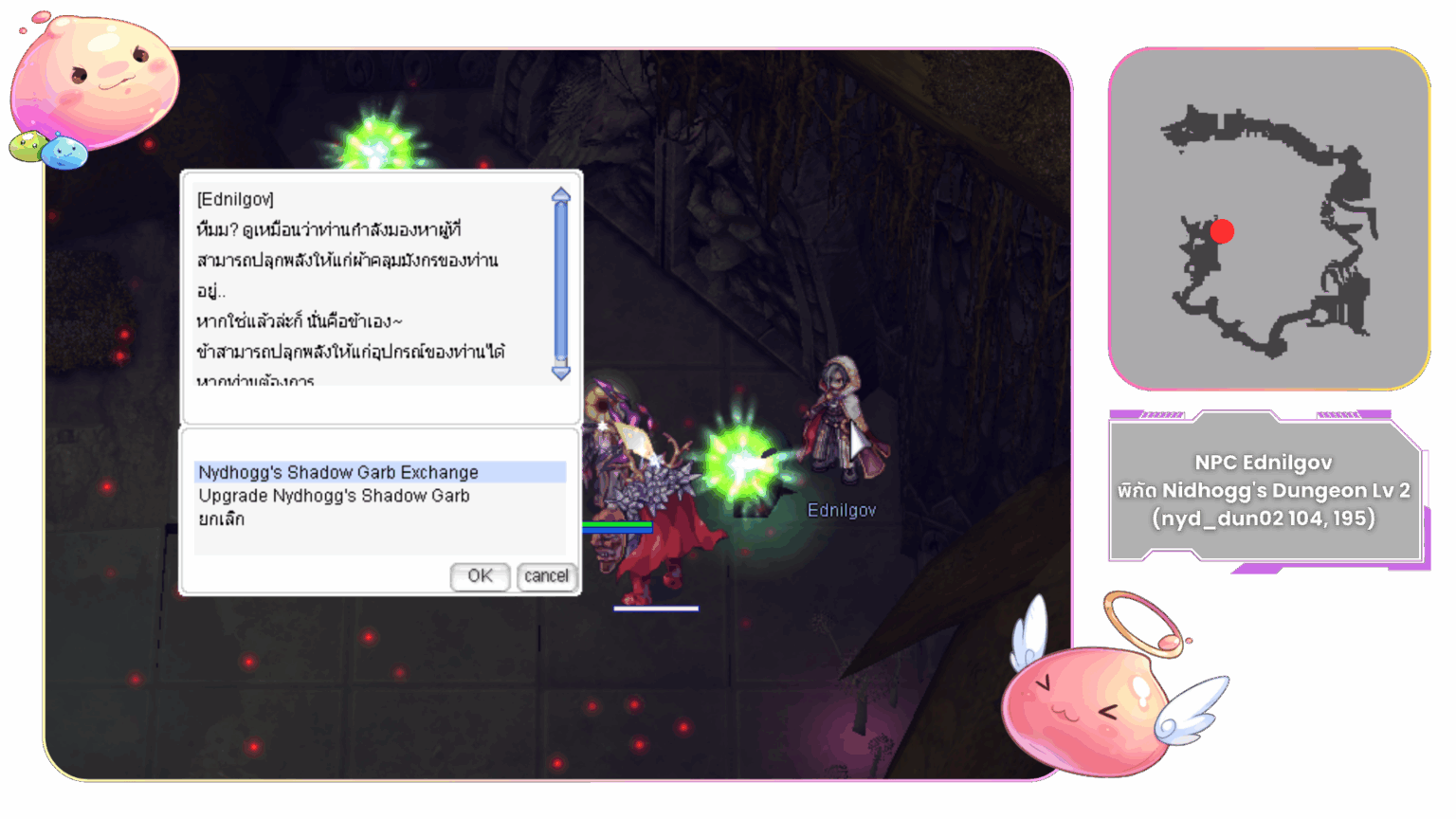 สามารถทำการอัปเกรด Nidhoggur’s Shadow Garb [1] ได้ที่ NPC Ednilgov ได้ที่พิกัด Nidhogg’s Dungeon Lv 2 (nyd_dun02 104, 195)