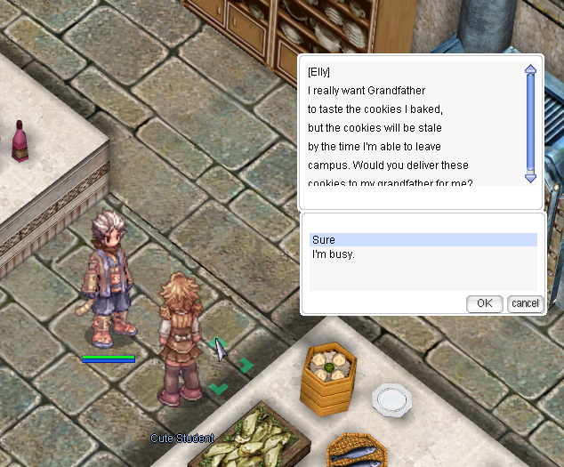 9. นำสิ่งของที่รวบรวมและ Delivery Package ![7488.png](https://irowiki.org/images/db/item/7488.png) ไปให้ Elly ที่ Kiel Hyre Academy เจ้าหน้าที่จะจดจำคุณและให้คุณเข้าไปส่งสินค้า Elly จะมอบ Well-Baked Cookie 5 ชิ้น![538.png](https://irowiki.org/images/db/item/538.png) ให้คุณเพื่อเป็นการขอบคุณ