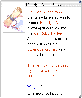 * เมื่อใช้ Kiel Hyre Quest Pass คุณจะได้รับไอเทม "Luxurious Keycard" โดยอัตโนมัติ