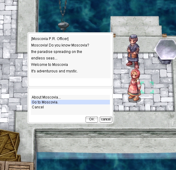 ค้นหา NPC "Moscovia P.R. Officer" ใกล้กับท่าเรือ พบได้ที่พิกัด (244, 65)