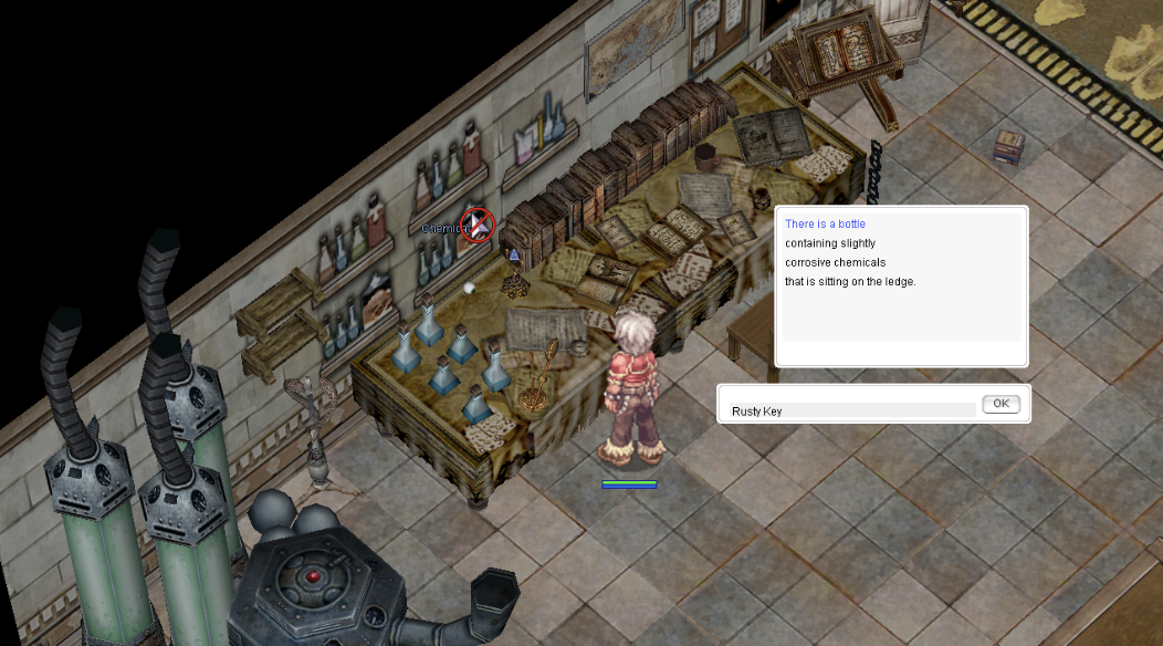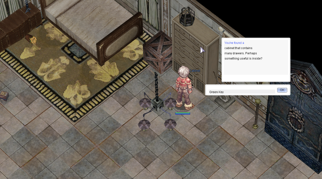 • ไปที่ ตู้สารเคมี (ใกล้โต๊ะทำงาน): ใช้ Rusty Key เพื่อรับ Green Key