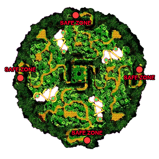 * แผนที่นี้มีเขตเซฟโซน 4 แห่ง ตั้งอยู่ที่มุมกลางของแผนที่ในทั้งสี่ทิศ ภายในเขตเซฟโซน ผู้เล่นจะไม่สามารถโจมตีกันเองหรือถูกโจมตีจากมอนสเตอร์ได้ นอกจากนี้ มอนสเตอร์จะไม่โจมตีผู้เล่นในเขตเซนโซนเหล่านี้