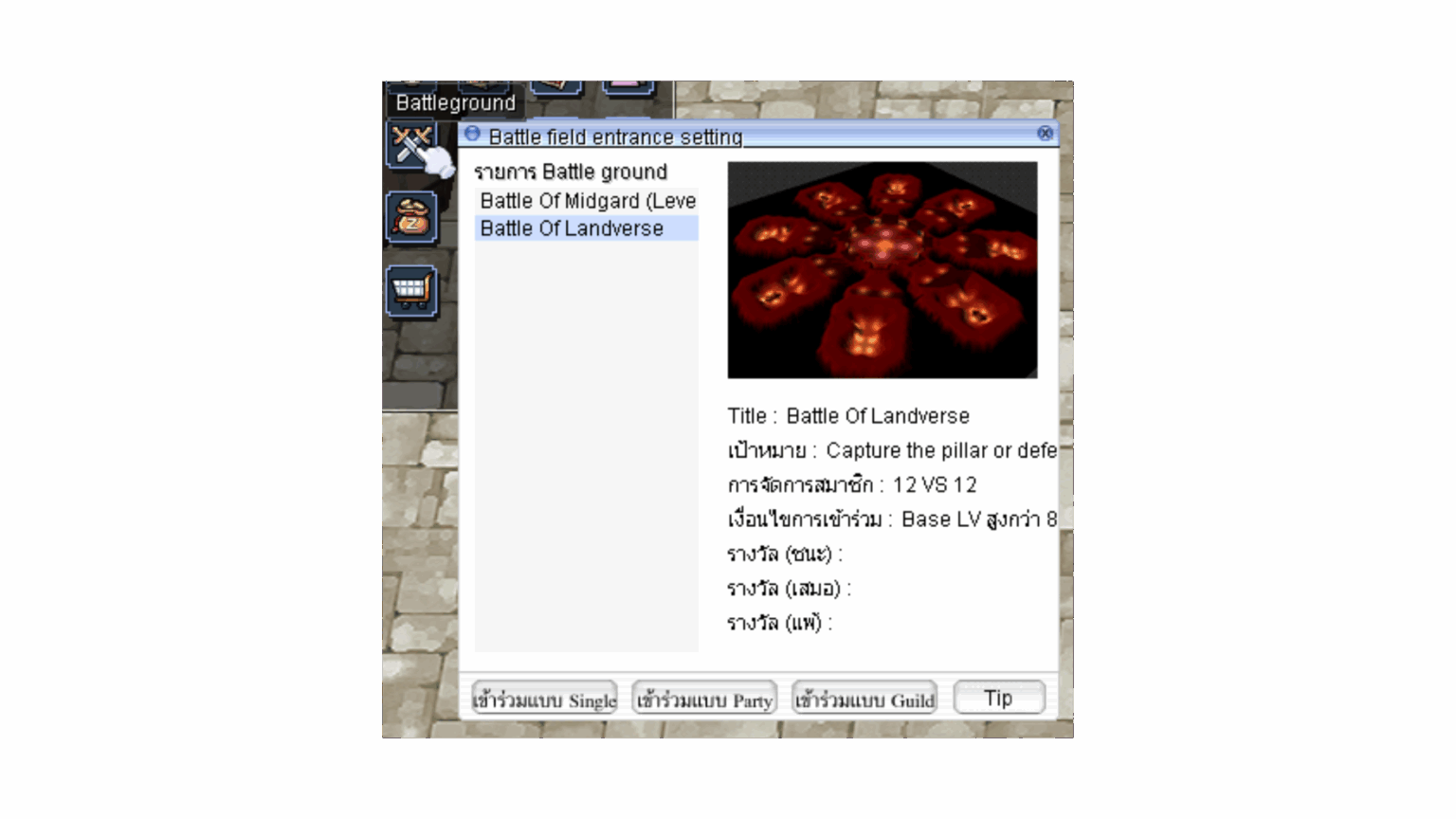 เมื่อถึงเวลา Main Event ผู้เล่นจะสามารถเลือกเพื่อต่อคิวผ่านปุ่ม Battle Ground เซิฟเวอร์จะประกาศว่า Battle of Landverse เริ่มแล้ว