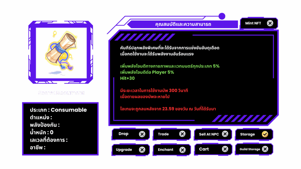 | <p>Rune of Magic</p><p><img src="https://news.rolth.maxion.gg/wp-content/uploads/2025/08/21894.png" alt="" height="62" width="29"></p>     | <ul><li>Int+ 20</li><li>ลดVCT 50%</li><li>ความเสียหายเวทมนตร์ทุกธาตุเพิ่มขึ้น 20%</li></ul><p><em>\*หากตายก่อนบัพหมด บัพจะหายทันที</em></p>        | 30 วินาที |