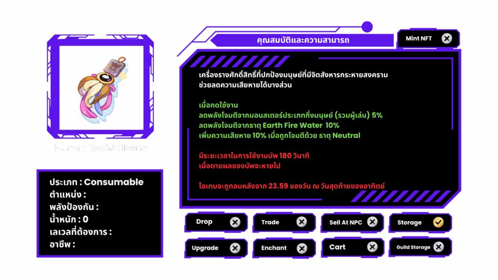 | <p>Rune of Vitality</p><p><img src="https://news.rolth.maxion.gg/wp-content/uploads/2025/08/21892.png" alt="" height="61" width="27"></p>  | <ul><li>Vit+ 20</li><li>DEF+ 100</li><li>ลดความเสียหายจาก Player 10%</li></ul><p><em>\*หากตายก่อนบัพหมด บัพจะหายทันที</em></p>                     | 30 วินาที |