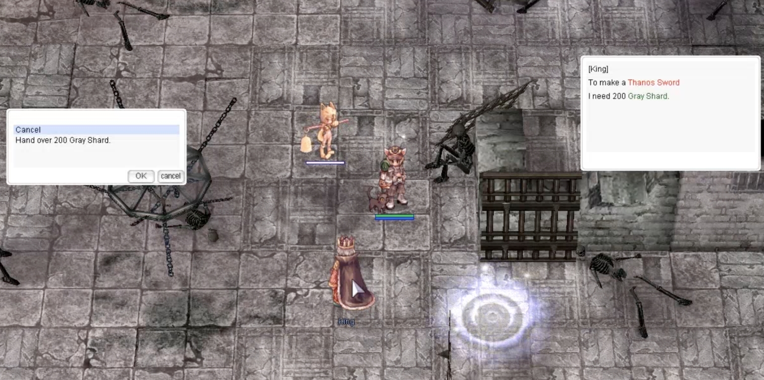 นี่เป็นจุดสิ้นสุดของ instance ก่อนออกเดินทาง คุณสามารถพูดคุยกับกษัตริย์ที่หมายเลข (205, 29) เพื่อแลกเปลี่ยน Grey Shards เป็นอาวุธ Thanatos และอุปกรณ์ของ Grey อาวุธแต่ละชิ้นต้องใช้ Grey Shards 200 ชิ้น และอุปกรณ์ Grey แต่ละชิ้นต้องใช้ Grey Shards 100 ชิ้น โปรดดูส่วนด้านล่างสำหรับรายการอาวุธและอุปกรณ์ที่มี