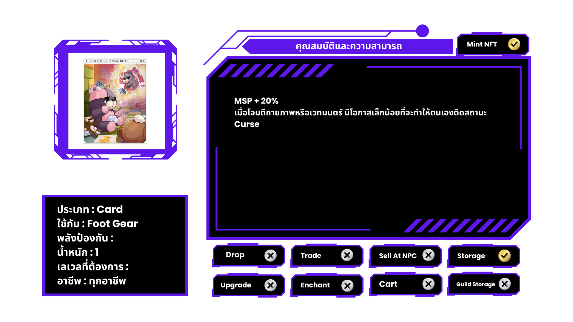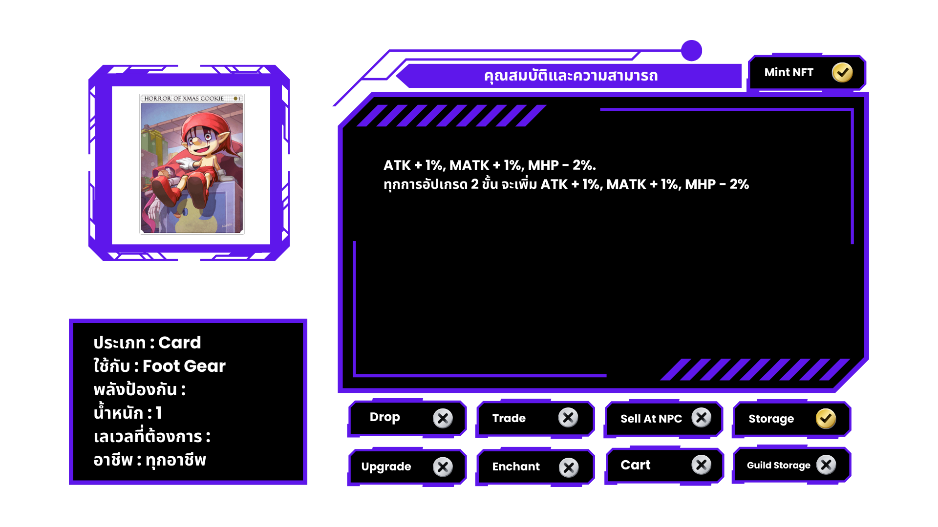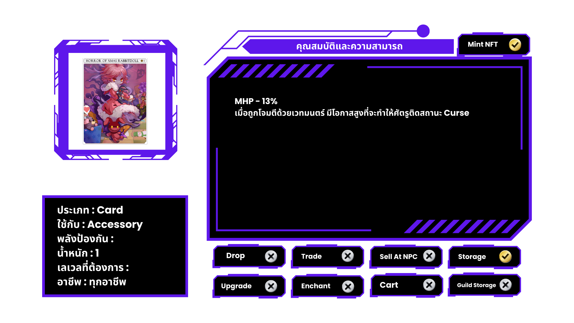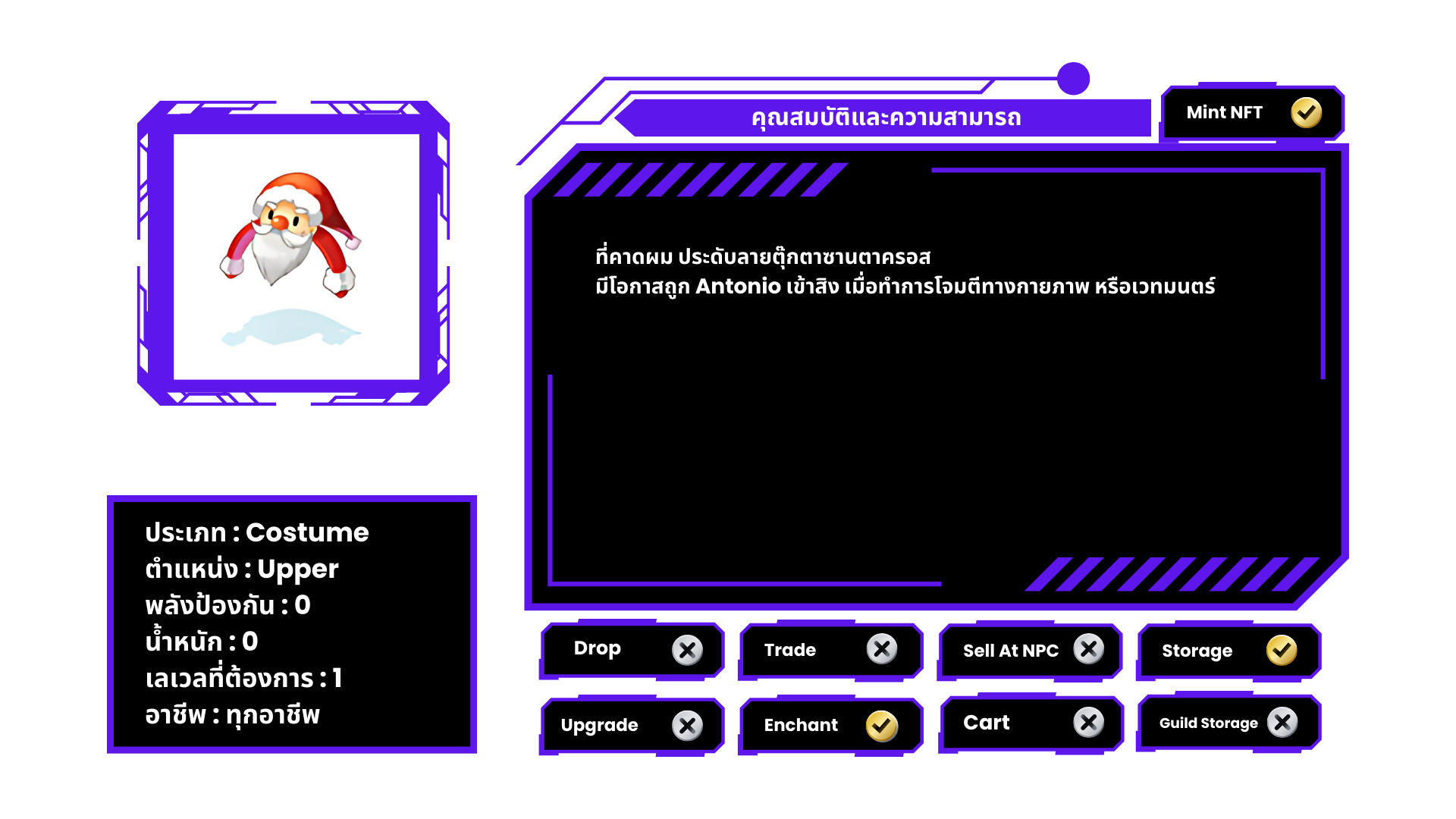 ที่คาดผม ประดับลายตุ๊กตาซานตาครอส มีโอกาสถูก Antonio เข้าสิง เมื่อทำการโจมตีทางกายภาพ หรือเวทมนตร์ หมายเหตุ ไม่สามารถแลกเปลี่ยนได้