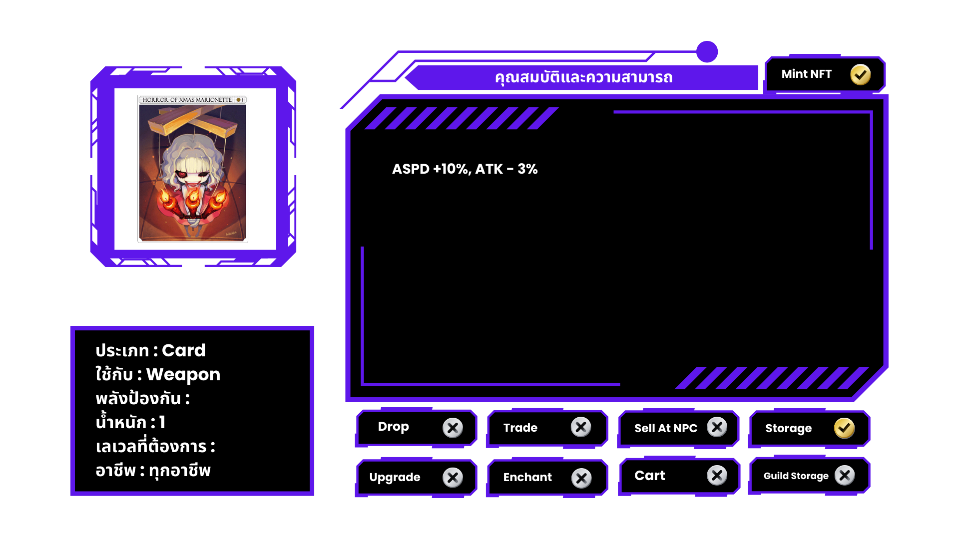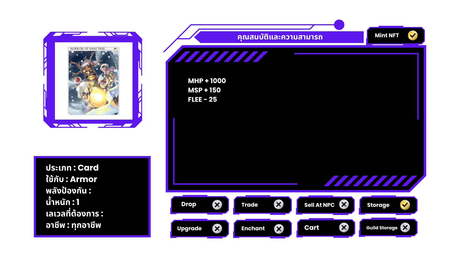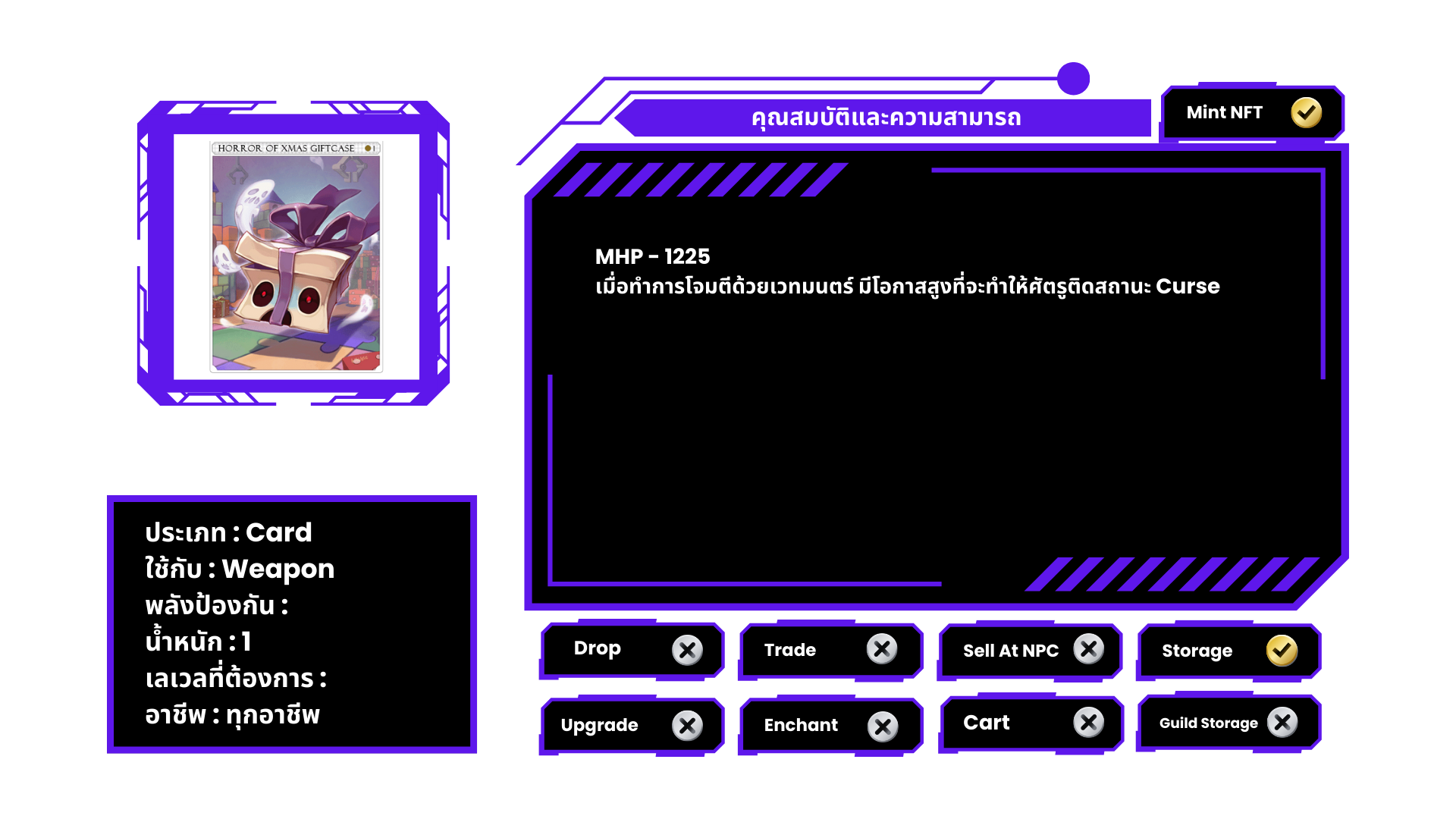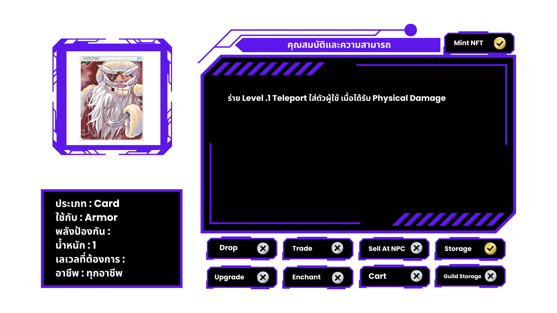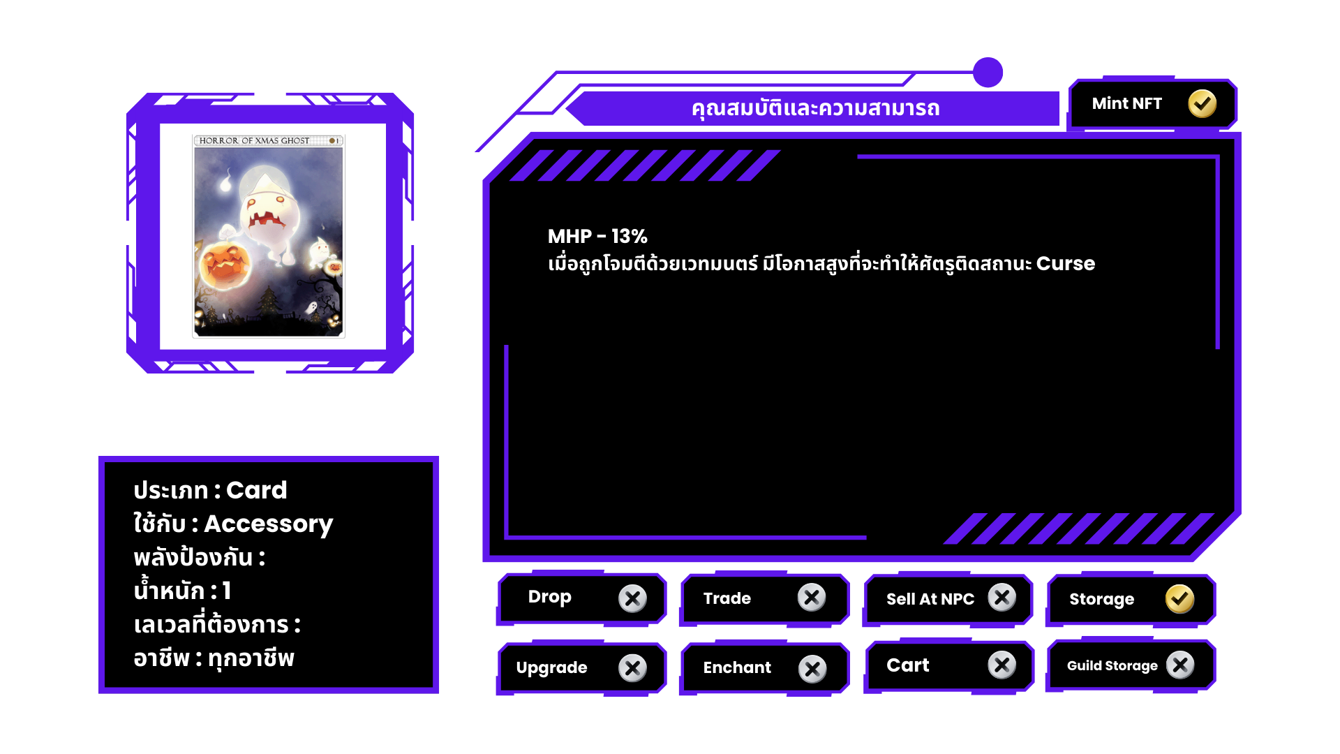 ที่คาดผม ประดับลายตุ๊กตาซานตาครอส มีโอกาสถูก Antonio เข้าสิง เมื่อทำการโจมตีทางกายภาพ หรือเวทมนตร์ หมายเหตุ ไม่สามารถแลกเปลี่ยนได้
