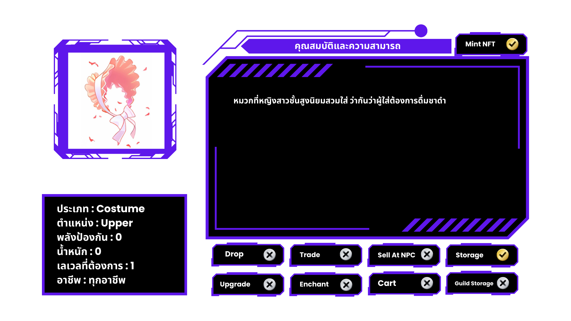หมวกที่หญิงสาวชั้นสูงนิยมสวมใส่ ว่ากันว่าผู้ใส่ต้องการดื่มชาดำ หมายเหตุ ไม่สามารถแลกเปลี่ยนได้