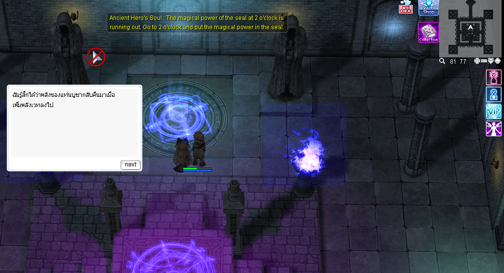 14.7 หากใส่พลังเวทย์สำเร็จ จะมีข้อความประกาศเป็นสีฟ้าว่า “ผนึกทำงานจากการใส่พลังเวทย์ลงไปบนแท่นบูชา”