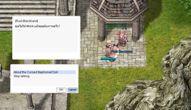 เข้าไปข้างในโบสถ์แล้วเดินไปตามทางจะพบกับ NPC Friar Patrick (พิกัด monk_test 307, 146) พูดคุยกดเลือกหัวข้อ “เกี่ยวกับ Cursed Bapjomet Doll”