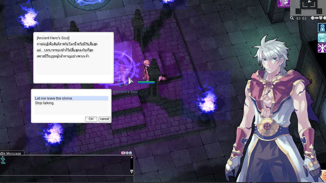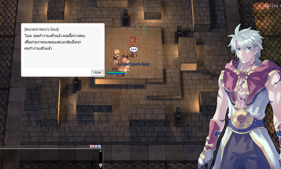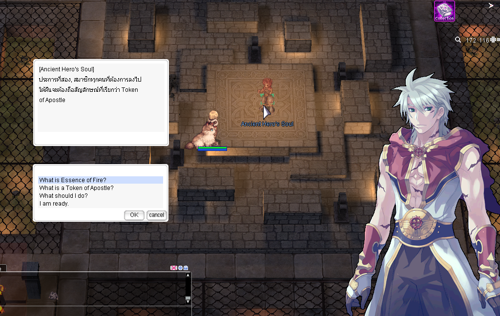 ไปบริเวณกลางแผนที่ (จุดสีฟ้า พิกัด 174, 119) กดคุยกับ Soul of Ancient Hero ให้เราเลือกตอบทุกข้อตามลำดับ และเลือกตอบ “ข้าพร้อมแล้ว” เป็นลำดับสุดท้าย เขาจะให้หัวหน้าปาร์ตี้รวบรวมไอเทม []Essence of Fire 10 ea และ [] Token of Apostle 1 ea กลับมาให้เขา