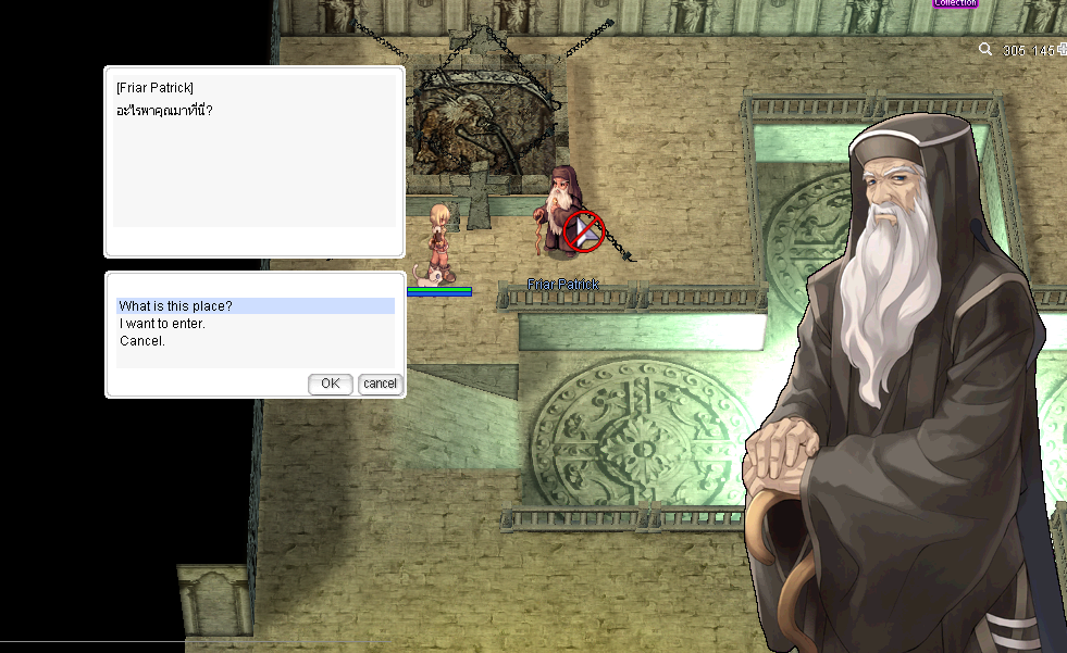 เดินทางเข้าไปยังข้างในโบสถ์แล้วเดินไปตามทาง จะพบกับ NPC Friar Patrick (พิกัด monk_test 307, 146)