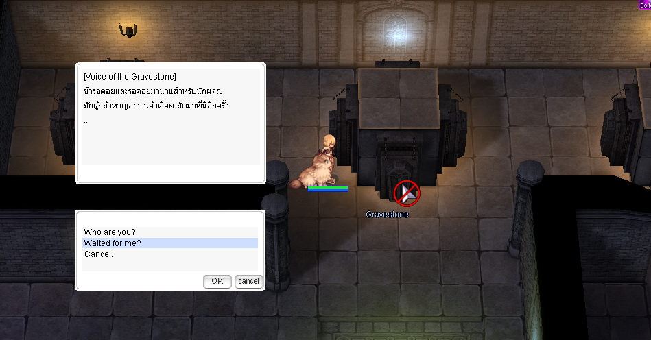 เมื่อได้รับไอเทม [] Pendant of Spirit 1 ea มาแล้ว ให้กลับไปคุยกับ NPC Falling Grave ที่จุดแรก(สีเขียว) อีกครั้ง (พิกัด 142, 219) เพื่อปลดปล่อยวิญญาณนักรบโบราณจากหลุมศพ