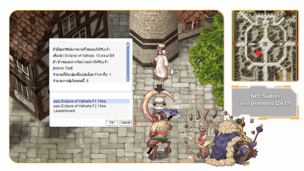 แล้วมอบให้กับ NPC Sultan (ที่พิกัด prontera 124 171) เพื่อทำการสุ่มของรางวัลดังต่อไปนี้