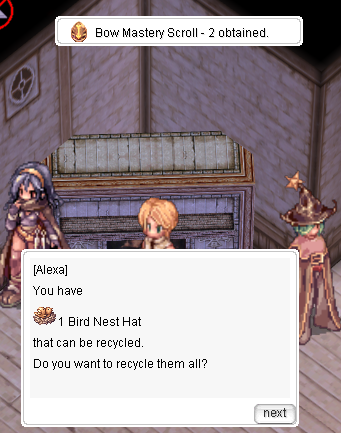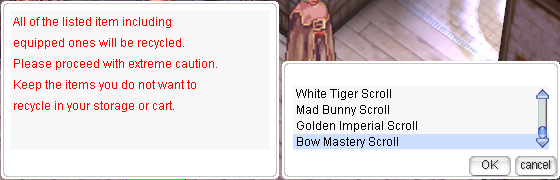 Gachapon Recycle system ช่วยให้คุณสามารถรีไซเคิลไอเทมที่คุณไม่ต้องการและได้รับ Scroll ที่เกี่ยวข้องกลับมาได้ เช่น หากคุณเปิด Bow Mastery Scroll และได้รับหมวก Bird Nest \[1] ที่คุณไม่ต้องการ คุณสามารถแลกเปลี่ยนได้เพื่อรับ Bow Mastery Scroll มาเปิดสุ่มไอเทมอีกครั้ง