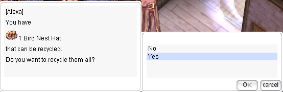 **ยืนยันการรีไซเคิล:** ยืนยันว่าคุณต้องการรีไซเคิลไอเทม Bird Nest Hat \[1] โปรดทราบว่าเมื่อคุณยืนยันแล้ว อุปกรณ์นี้จะถูกลบออกจากคลังของคุณอย่างถาวร
