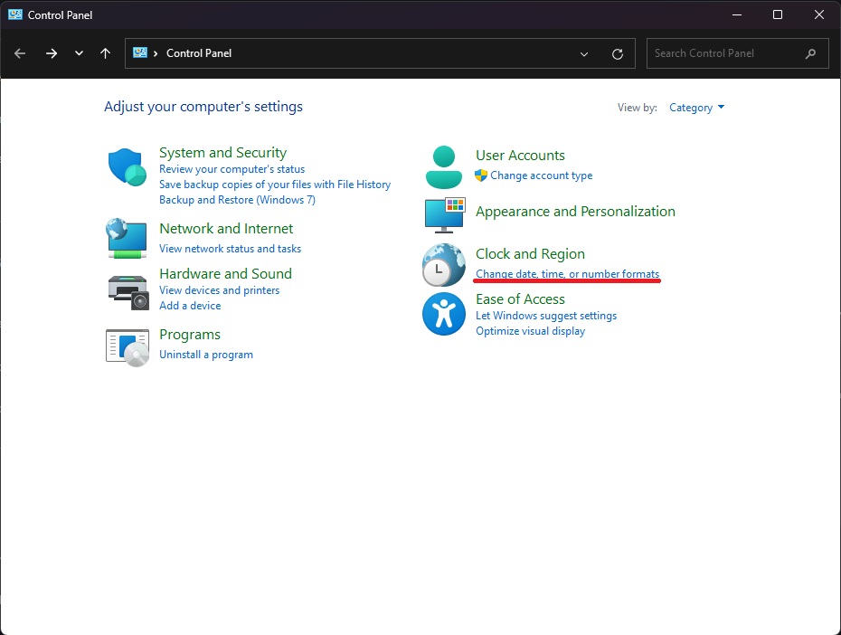 ใน Control Panel, คลิกที่ "Change date, time, or number formats" (อยู่เหนือเส้นสีแดงในภาพ)