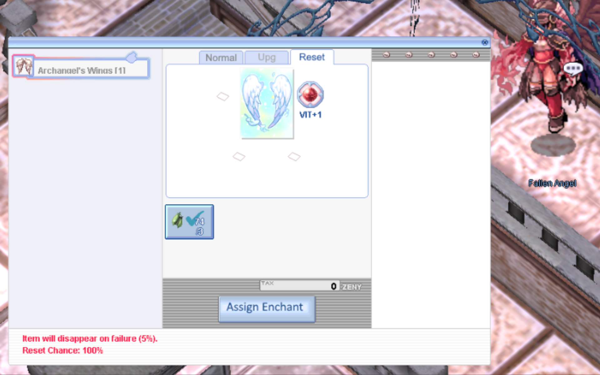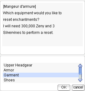 สามารถรีเซ็ตออปชันได้โดยใช้ 300,000 zeny และ 3 Silvervine เมื่อรีเซ็ตไอเทมจะกลับไปสู่ค่าเริ่มต้นโดยไม่มีออปชันใดๆ