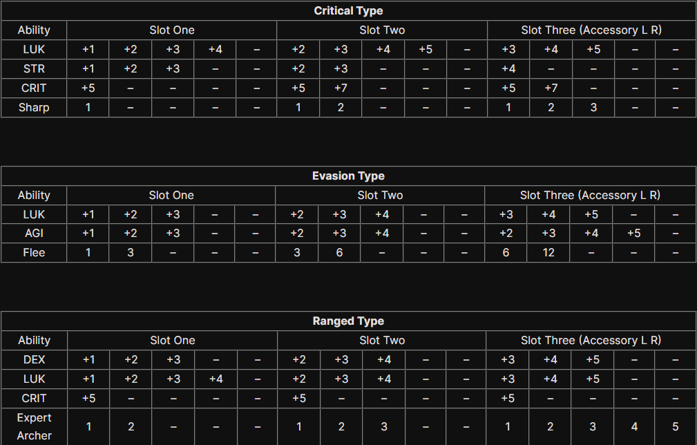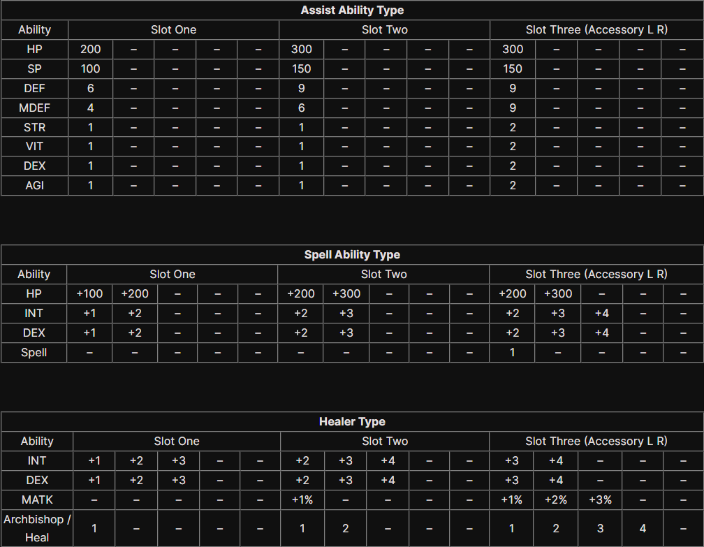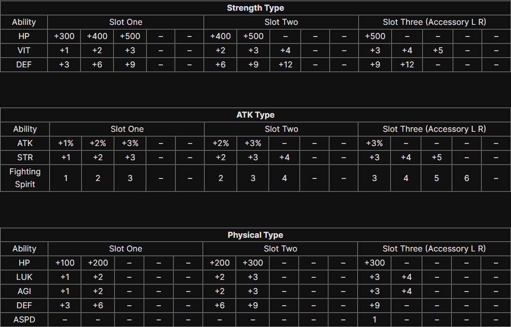 ประเภท Strength, ประเภท ATK , ประเภท Physical , ประเภท Critical , ประเภท Evasion , ประเภท Ranged , ประเภท Assist Ability , ประเภท Spell Ability , ประเภท Healer.