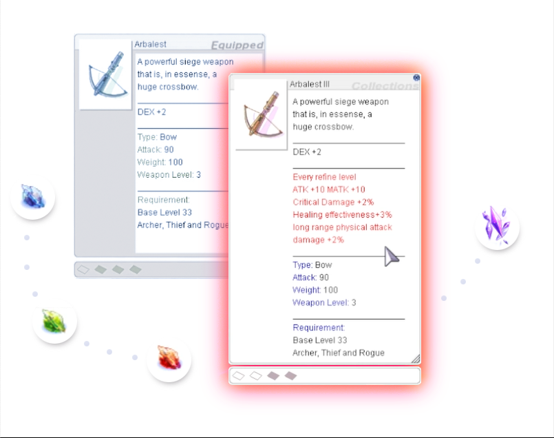 แต่ละเกรดจะมีโบนัสสเตตัสที่แน่นอนเมื่อเปรียบเทียบกับไอเทมที่ไม่มีเกรด ดูค่าที่แน่นอนจากการตีบวก
