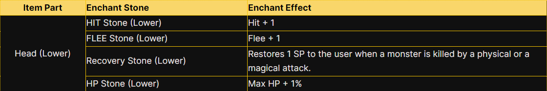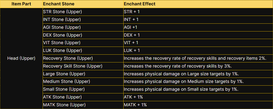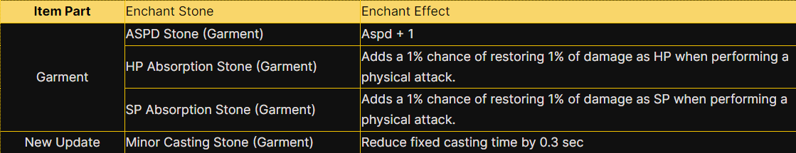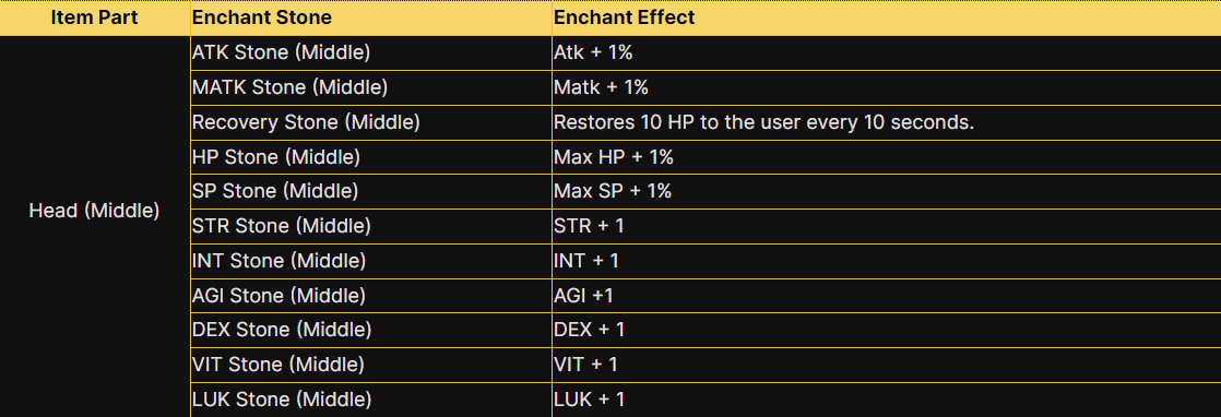 ### รายการ Enchantment Stone ที่สามารถรับได้