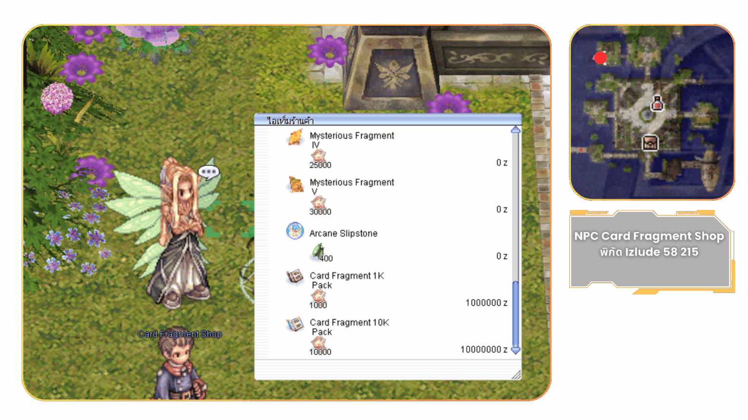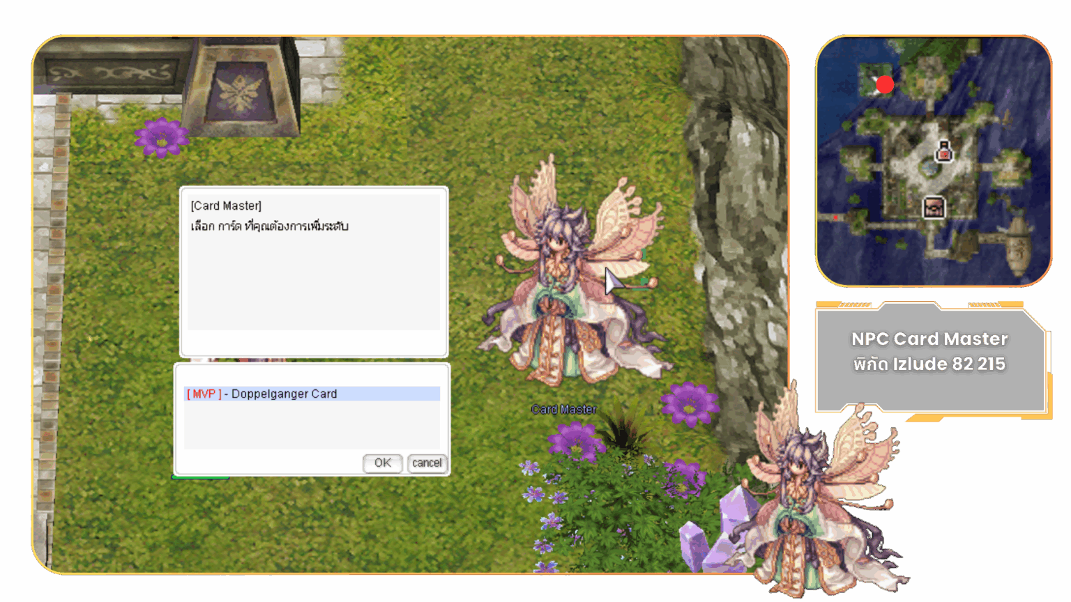 * พูดคุยกับ NPC Card Master พิกัด Izlude 82 215 กดเลือกที่เมนู “Upgrade Card” ระบบจะแสดงรายการการ์ดทั้งหมดที่ผู้เล่นมีอยู่ในตัว