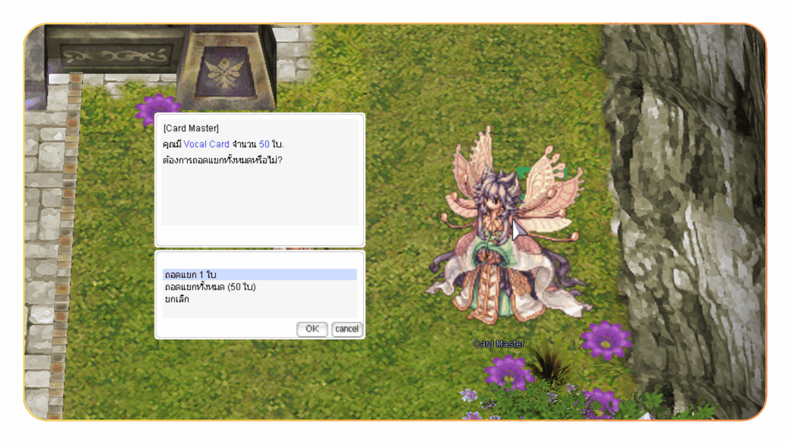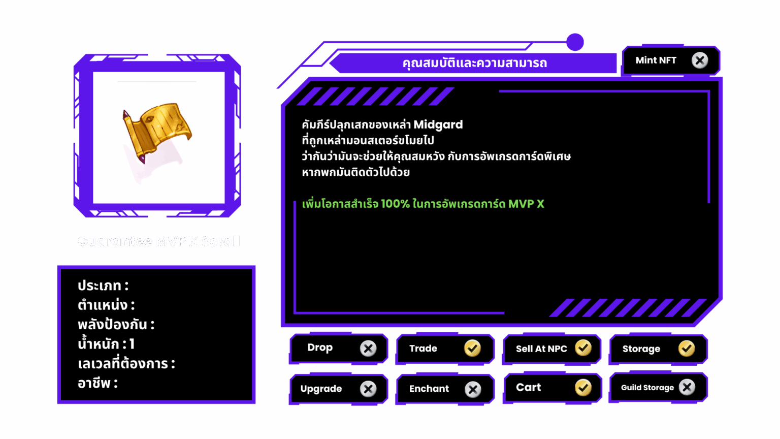 * หากผู้เล่นมี Guarantee MVP X Scroll ในกระเป๋า NPC Card Master จะสอบถามว่า “คุณต้องการใช้มันเพื่อเพิ่มอัตราความสำเร็จ 100% หรือไม่?” ผู้เล่นสามารถ เลือกได้ว่าจะใช้หรือไม่ใช้&#x20;