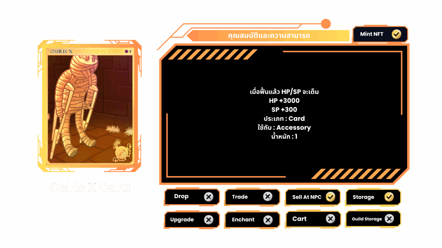 | Osiris X Card           | <p>เมื่อฟื้นแล้ว HP/SP จะเต็ม<br>HP +3000 / SP +300<br>ประเภท : Card / ใช้กับ : Accessory / น้ำหนัก : 1</p>                                                                                                                                        |