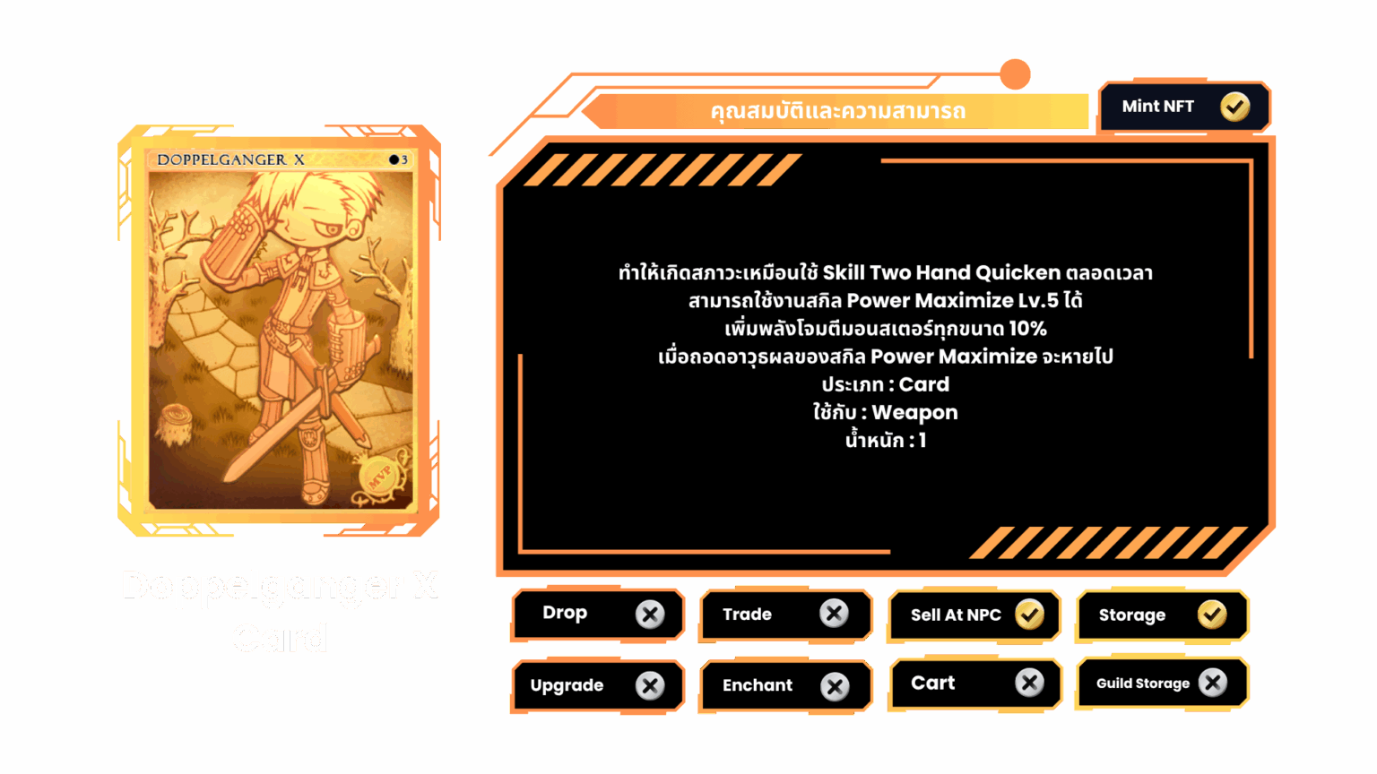 | Doppelganger X Card     | <p>ทำให้เกิดสภาวะเหมือนใช้ Skill Two Hand Quicken ตลอดเวลา<br>สามารถใช้งานสกิล Power Maximize Lv.5 ได้<br>เพิ่มพลังโจมตีมอนสเตอร์ทุกขนาด 10%<br>เมื่อถอดอาวุธผลของสกิล Power Maximize จะหายไป<br>ประเภท : Card / ใช้กับ : Weapon / น้ำหนัก : 1</p> |