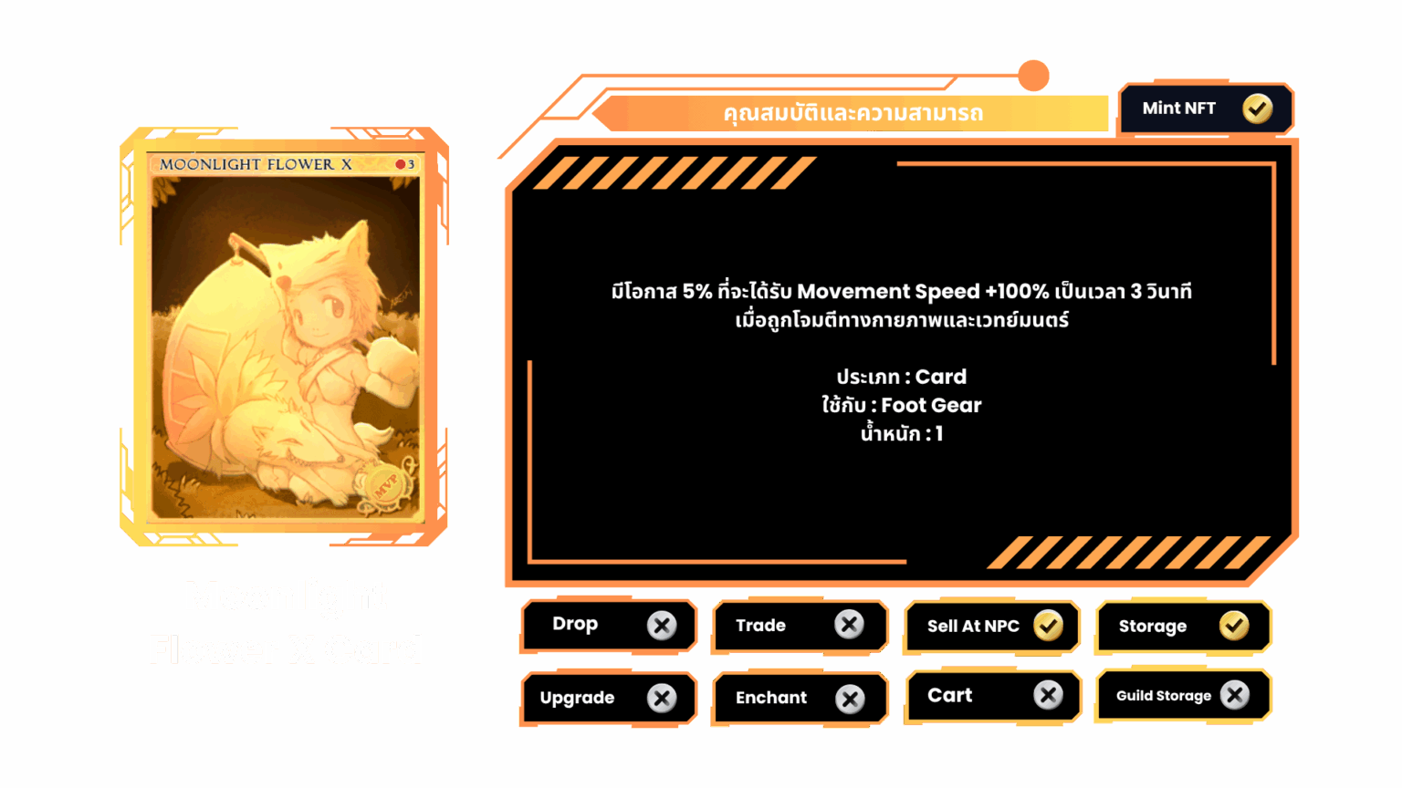 | Moonlight Flower X Card | <p>มีโอกาส 5% ที่จะได้รับ Movement Speed +100% เป็นเวลา 3 วินาที<br>เมื่อถูกโจมตีทางกายภาพและเวทย์มนตร์<br>ประเภท : Card / ใช้กับ : Foot Gear / น้ำหนัก : 1</p>                                                                                    |