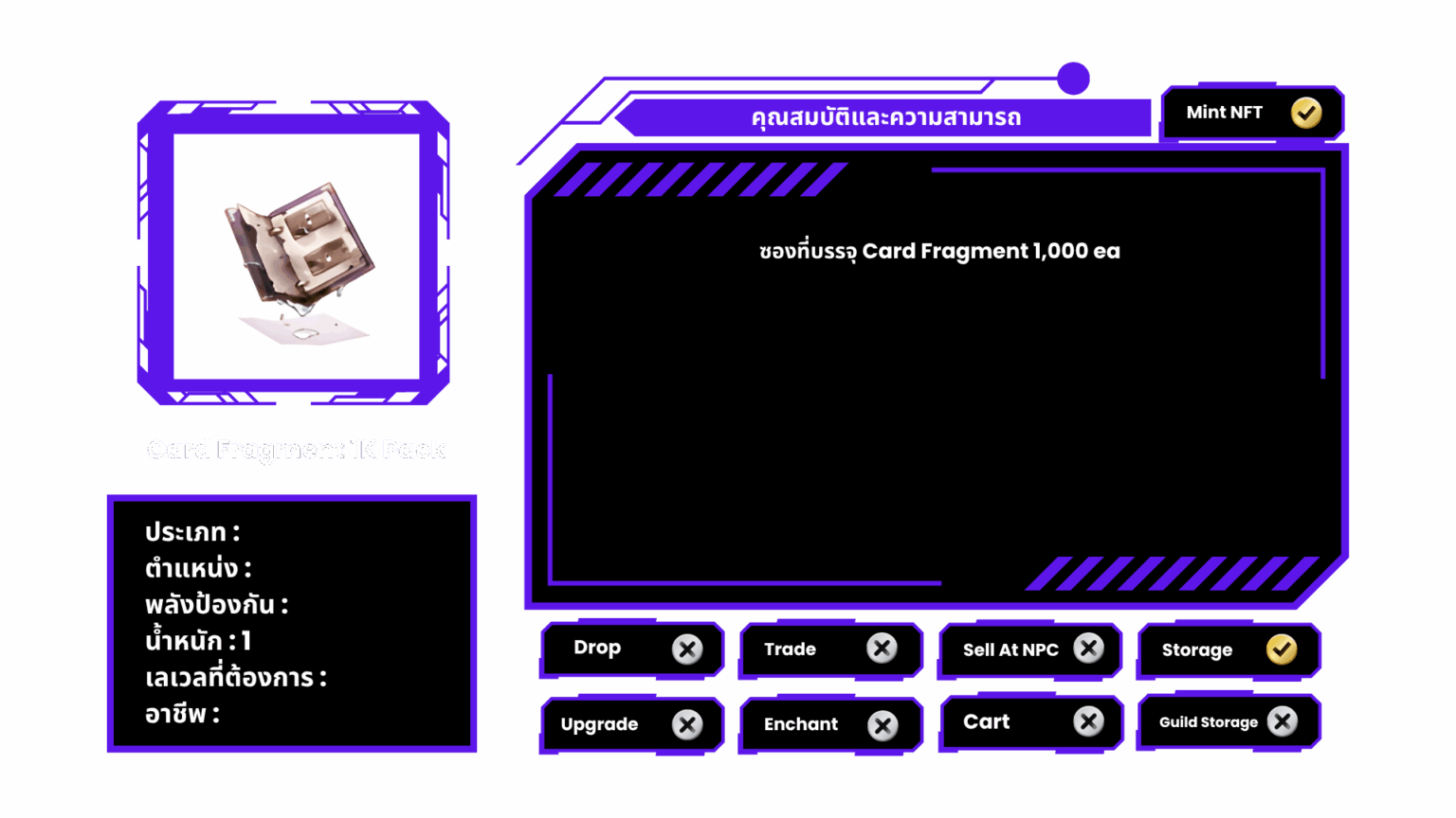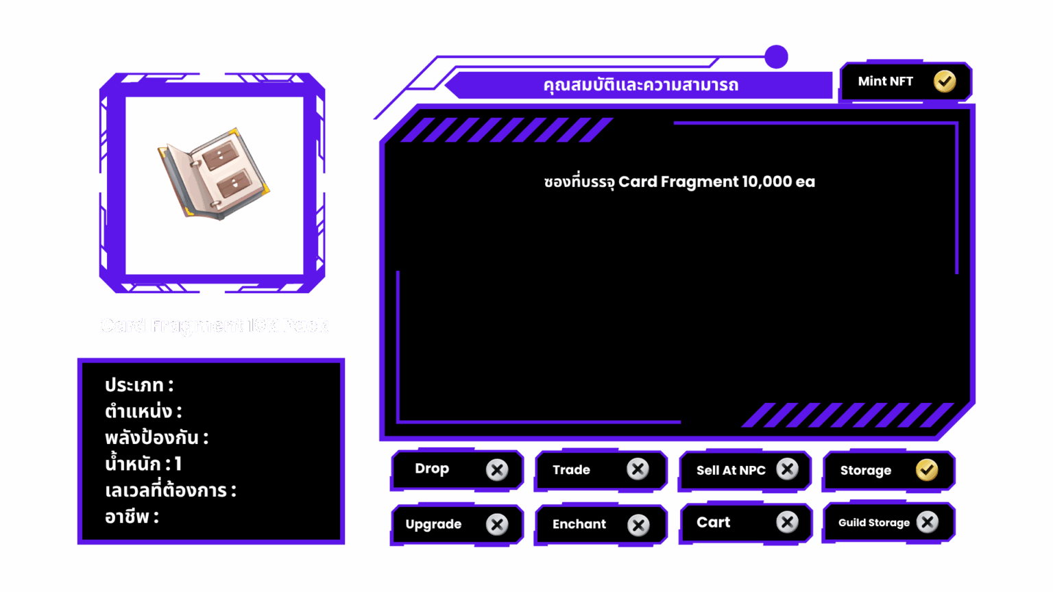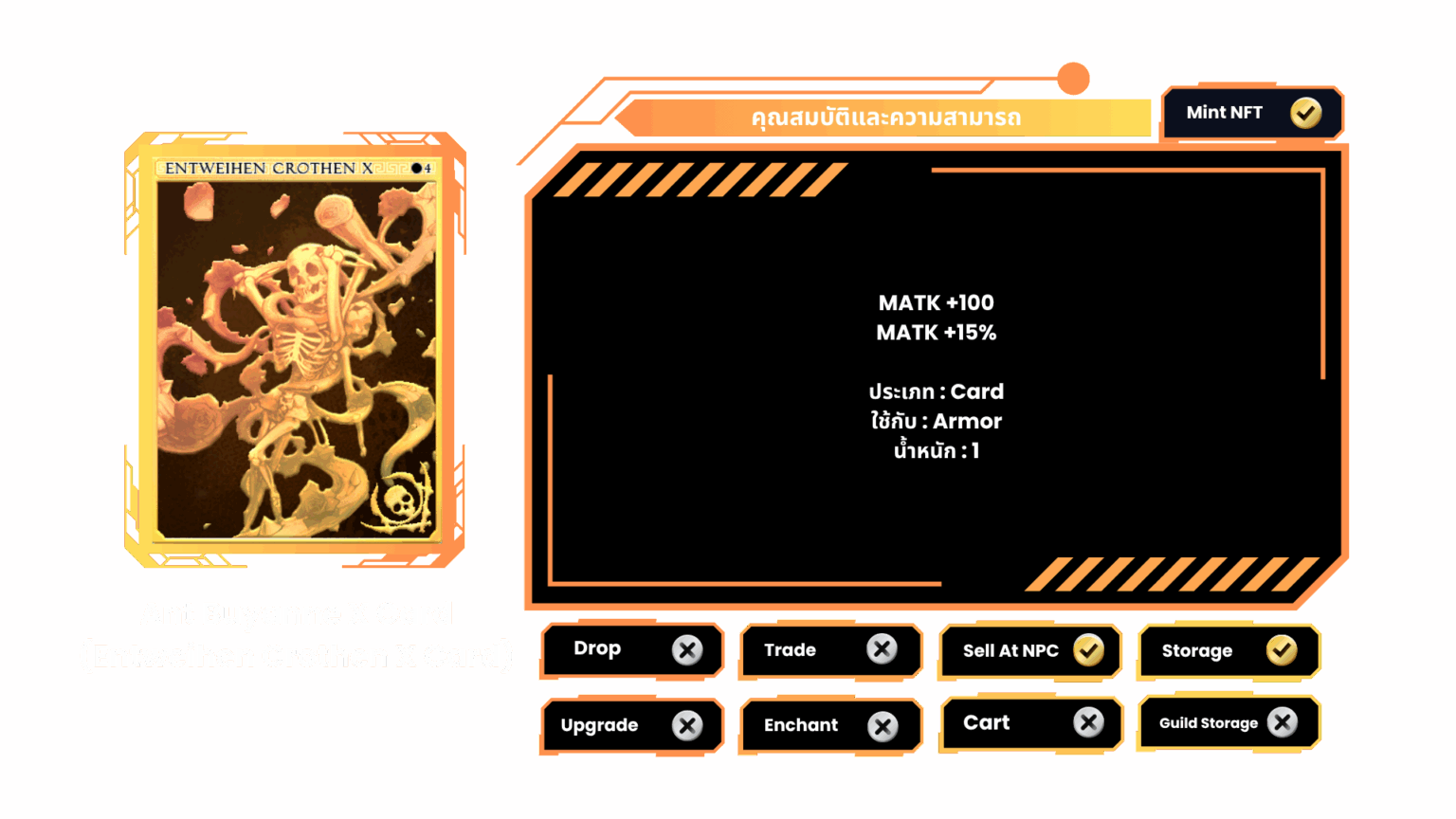 | Ant Buyanne X Card      | <p>MATK +100 / MATK +15%<br>ประเภท : Card / ใช้กับ : Armor / น้ำหนัก : 1</p>                                                                                                                                                                       |