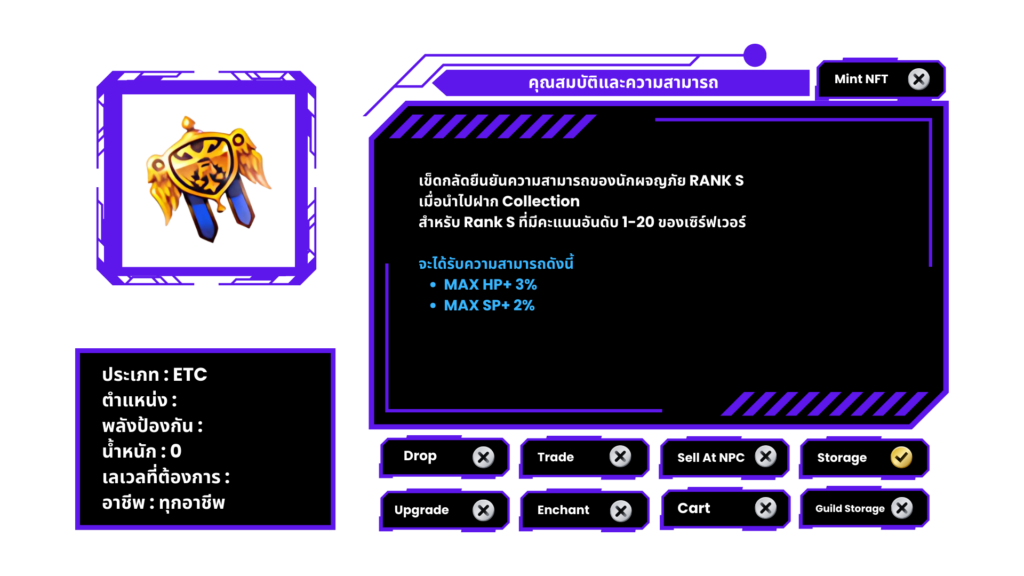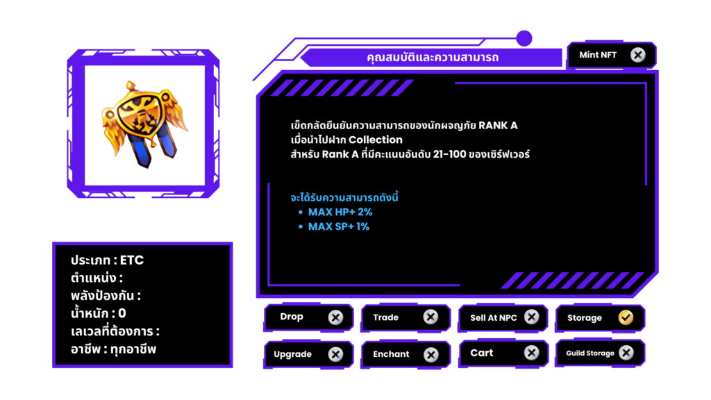 <table data-header-hidden><thead><tr><th width="247"></th><th></th></tr></thead><tbody><tr><td>RANKING BUFF ACCOUNT</td><td></td></tr><tr><td>Rank</td><td>รายละเอียด BUFF</td></tr><tr><td>E – Beginner</td><td>EXP+5% Drop+5%</td></tr><tr><td>D – Rookie</td><td><p>All status+1</p><p>EXP+5% Drop+5%</p></td></tr><tr><td>C – Apprentice</td><td><p>All status+2</p><p>ATK+3</p><p>MATK+3</p><p>EXP+5% Drop+5%</p></td></tr><tr><td><p>B – Strider</p><p><em>หมายเหตุ : Rank A ที่อันดับต่ำกว่า 50 และ Rank B</em></p></td><td><p>All status+2</p><p>ATK+5</p><p>MATK+5</p><p>เพิ่มความเสียหายมอนเตอร์คลาสบอส 3%</p><p>EXP+5% Drop+5%</p></td></tr><tr><td><p>A – Pioneer</p><p><em>หมายเหตุ : อันดับ 21 – 50 เท่านั้นจึงจะมีสิทธิ์ได้รับรางวัลประจำ Season</em></p></td><td><p>All status+3</p><p>ATK+10</p><p>MATK+10</p><p>เพิ่มความเสียหายมอนเตอร์ทุกขนาด 3%</p><p>EXP+5% Drop+5%</p></td></tr><tr><td><p>S – Forerunner</p><p><em>หมายเหตุ : อันดับ 1 – 20 เท่านั้นจึงจะมีสิทธิ์ได้รับรางวัลประจำ Season</em></p></td><td><p>All status+5</p><p>ลดดาเมจมอนเตอร์กึ่งมนุษย์ 5% (รวมผู้เล่น)</p><p>เพิ่มความเสียหายมอนเตอร์ทุกประเภท 5%</p><p>ATK+15</p><p>MATK+15</p><p>EXP+10% Drop+10%</p></td></tr></tbody></table>