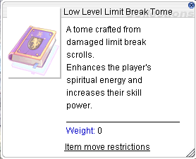 Skills Limit Scrolls หาได้จาก Elite Monsters และ Skill Limit Break Tome จาก MVP ผู้เล่นจะต้องสร้าง Skill Limit Break Tome โดยใช้ 10 Skills Limit Scrolls จาก Universal Exchange เพื่อปลดล็อค ในปัจจุบัน ผู้เล่นสามารถทำลายขีดจำกัดสกิลของตัวเองจาก 1 เป็น 3 ได้โดยใช้ Low Level Limit Break Tome ผู้เล่นจะสามารถทำลายขีดจำกัดสกิลของตัวเองจาก 3 เป็น 10 ได้ในอนาคตเมื่อมีการอัปเดตเนื้อหาเพิ่มเติม