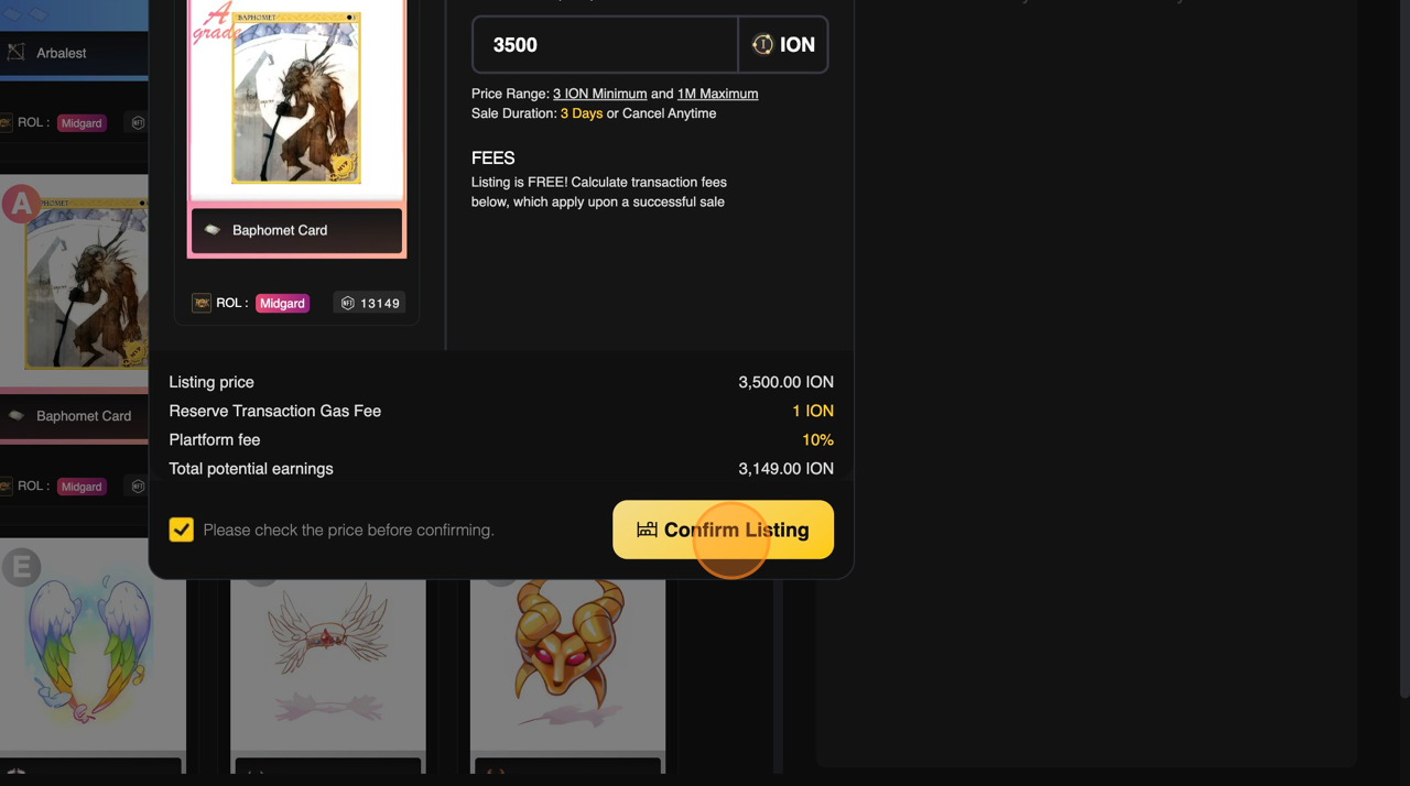 6. คลิกที่ **\[Start Listing]** เพื่อลงรายการไอเทมใน **Marketplace**