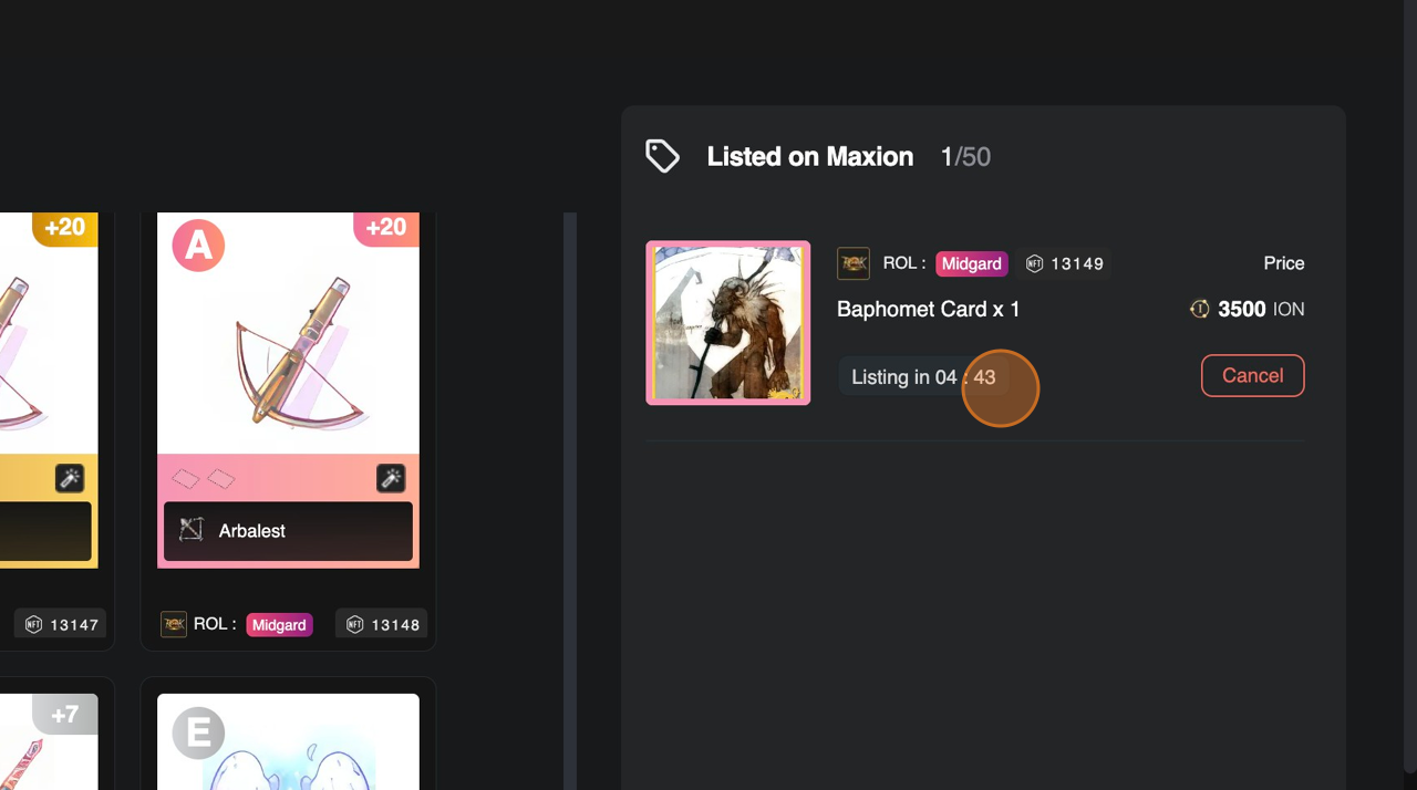 7. รายการไอเทมจะแสดงในส่วน **\[Listed on Maxion]** ในหน้า **Inventory** และ จะแสดงผลในหน้าแสดงสินค้าหลังผ่านไป 5 นาที