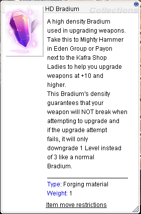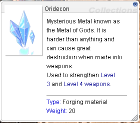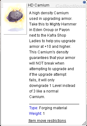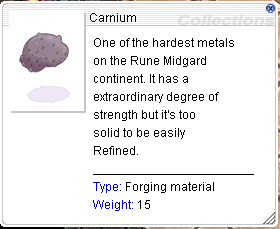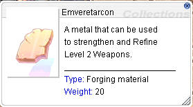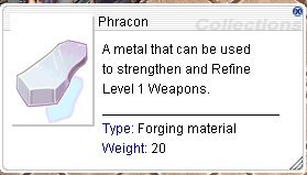 <table data-view="cards" data-full-width="true"><thead><tr><th></th><th></th><th></th></tr></thead><tbody><tr><td><strong>Adamantine Blessing</strong></td><td><img src="https://3132535327-files.gitbook.io/~/files/v0/b/gitbook-x-prod.appspot.com/o/spaces%2FxTAc4SBp5rgWM4FIglMO%2Fuploads%2FYhFZ9TxTYn0ULylsB7df%2Fimage.png?alt=media&#x26;token=6abefee2-991c-47fc-bb55-ee09a550c9bc" alt=""></td><td>This unique material resource in the world of Ragnarok Landverse is utilized for both refining and enchanting purposes, The quantity used depends on refine level of equipment.</td></tr><tr><td><strong>Phracon</strong></td><td><img src="https://3132535327-files.gitbook.io/~/files/v0/b/gitbook-x-prod.appspot.com/o/spaces%2FxTAc4SBp5rgWM4FIglMO%2Fuploads%2F1SLFg98HCrKmmImHlCqW%2Fimage.png?alt=media&#x26;token=216fdca0-892e-4660-a701-323a579319fc" alt=""></td><td>A metal that can be used to strengthen and upgrade <strong>Level 1</strong> Weapons.</td></tr><tr><td><strong>Emveretarcon</strong></td><td><img src="https://3132535327-files.gitbook.io/~/files/v0/b/gitbook-x-prod.appspot.com/o/spaces%2FxTAc4SBp5rgWM4FIglMO%2Fuploads%2FF26d7aGDmJTxYQlxlWrE%2Fimage.png?alt=media&#x26;token=754ac85c-5715-4d04-9346-7ac945566145" alt=""></td><td>A metal that can be used to strengthen and upgrade <strong>Level 2</strong> Weapons.<br></td></tr><tr><td><strong>Oridecon</strong></td><td><img src="https://3132535327-files.gitbook.io/~/files/v0/b/gitbook-x-prod.appspot.com/o/spaces%2FxTAc4SBp5rgWM4FIglMO%2Fuploads%2F8CmDFkjVEQfCVVeSBdqp%2Fimage.png?alt=media&#x26;token=4593f439-7959-4989-bef1-4de98c12d991" alt=""></td><td>Pure Oridecon metal. Widely known as the Blessed Metal, it can increase the damage of weapons once welded to them. Used to temper <strong>Level 3 and 4 weapons</strong>.</td></tr><tr><td><strong>Enriched Oridecon</strong></td><td><img src="https://3132535327-files.gitbook.io/~/files/v0/b/gitbook-x-prod.appspot.com/o/spaces%2FxTAc4SBp5rgWM4FIglMO%2Fuploads%2F7y5UpNZx7xEot085Bstk%2Fimage.png?alt=media&#x26;token=f86d1b5f-f567-43ae-a6a0-d99c3665ce39" alt=""></td><td>A dense Oridecon, buried deep underground, is used as a material to create stronger weapon. It is used in refinement system to increase the success rate of refinement armor.</td></tr><tr><td><strong>Elunium</strong></td><td><img src="https://3132535327-files.gitbook.io/~/files/v0/b/gitbook-x-prod.appspot.com/o/spaces%2FxTAc4SBp5rgWM4FIglMO%2Fuploads%2FzuaZpTWRxRPT0Ys3wI0o%2Fimage.png?alt=media&#x26;token=a92dde4d-f951-43c5-9fd4-ae24314ad105" alt=""></td><td>A very light, non-toxic metal used for refining and toughening <strong>Armor</strong>.</td></tr><tr><td><strong>Enriched Elunium</strong></td><td><img src="https://3132535327-files.gitbook.io/~/files/v0/b/gitbook-x-prod.appspot.com/o/spaces%2FxTAc4SBp5rgWM4FIglMO%2Fuploads%2Ft5FjUp27EiQ5UXZsMcAv%2Fimage.png?alt=media&#x26;token=9c4cbe1b-dd64-4614-a588-604adfb39f21" alt=""></td><td>A concentrated Elunium, buried deep underground, is used as a material to create stronger armor. It is used in refinement system to increase the success rate of refinement armor.</td></tr><tr><td><strong>Carnium</strong></td><td><img src="https://3132535327-files.gitbook.io/~/files/v0/b/gitbook-x-prod.appspot.com/o/spaces%2FxTAc4SBp5rgWM4FIglMO%2Fuploads%2FBUPneF9paAus6KuEchbT%2Fimage.png?alt=media&#x26;token=32a1fb0b-99f7-4cd2-a3af-1cdece4ddfa7" alt=""></td><td>The strongest metal on the midgard continent, and because of its strength is incredibly difficult to forge. used for refining and toughening <strong>Armor</strong> that level of refinement more than +10 when attempting to upgrade and if the upgrade attempt fails, it will only <strong>downgrade 3 level</strong> instead of 1 like a HD Carnium.</td></tr><tr><td><strong>Bradium</strong></td><td><p><img src="https://3132535327-files.gitbook.io/~/files/v0/b/gitbook-x-prod.appspot.com/o/spaces%2FxTAc4SBp5rgWM4FIglMO%2Fuploads%2FXAy2y8zrweN3AwfH1wy9%2Fimage.png?alt=media&#x26;token=bf40debb-4ac6-45e2-ba11-41c6b005cf30" alt=""></p><p>The strongest mineral found in the Ash Vacuum. It seems very difficult to work with, but with research its come to be the best ore for forging <strong>weapons</strong> that level of refinement more than +10 when attempting to upgrade and if the upgrade attempt fails, it will only <strong>downgrade 3 level</strong> instead of 1 like a HD Bradium.</p></td><td></td></tr><tr><td><strong>HD Carnium</strong></td><td><img src="https://3132535327-files.gitbook.io/~/files/v0/b/gitbook-x-prod.appspot.com/o/spaces%2FxTAc4SBp5rgWM4FIglMO%2Fuploads%2FG3ec8BhfCRSoURMNYwVe%2Fimage.png?alt=media&#x26;token=ad489ddb-38e7-48b9-a731-3f32fab53fcc" alt=""></td><td>A high density Carnium used in upgrading armor. used for refining and toughening <strong>Armor</strong> that level of refinement more than +10 and higher. This Carnium's density guarantees that your armor will NOT break when attempting to upgrade and if the upgrade attempt fails, it will only <strong>downgrade 1 level</strong> instead of 3 like a normal Carnium.</td></tr><tr><td><strong>HD Bradium</strong></td><td><img src="https://3132535327-files.gitbook.io/~/files/v0/b/gitbook-x-prod.appspot.com/o/spaces%2FxTAc4SBp5rgWM4FIglMO%2Fuploads%2FlWWk926oIRbcnFDSqaXK%2Fimage.png?alt=media&#x26;token=4e666022-e482-4df9-86e0-dbe4cc60501a" alt=""></td><td>A high density Bradium used in upgrading weapons.  used for refining and forging <strong>weapons</strong> at +10 and higher. This Bradium's density guarantees that your weapon will NOT break when attempting to upgrade and if the upgrade attempt fails, it will only <strong>downgrade 1 level</strong> instead of 3 like a normal Bradium.</td></tr><tr><td></td><td></td><td></td></tr></tbody></table>