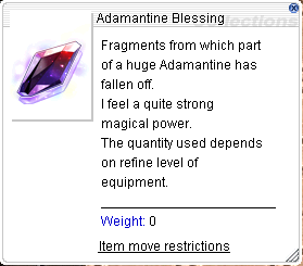 <table data-full-width="true"><thead><tr><th width="150" align="center">Refine Levels</th><th width="119" align="center">Adamantine Blessing</th><th width="112" align="center">Material 1</th><th width="104" align="center">Rate 1 (%)</th><th align="center">Price 1</th><th width="178" align="center">Downgrade Amount 1</th><th width="119" align="center">Material 2</th><th width="111" align="center">Rate 2 (%)</th><th align="center">Price 2</th><th align="center">Downgrade Amount 2</th></tr></thead><tbody><tr><td align="center">1</td><td align="center">3</td><td align="center">Oridecon</td><td align="center">95</td><td align="center">5000</td><td align="center">1</td><td align="center">Enriched_Oridecon</td><td align="center">100</td><td align="center">2000</td><td align="center">1</td></tr><tr><td align="center">2</td><td align="center">6</td><td align="center">Oridecon</td><td align="center">95</td><td align="center">5000</td><td align="center">1</td><td align="center">Enriched_Oridecon</td><td align="center">100</td><td align="center">2000</td><td align="center">1</td></tr><tr><td align="center">3</td><td align="center">9</td><td align="center">Oridecon</td><td align="center">95</td><td align="center">5000</td><td align="center">1</td><td align="center">Enriched_Oridecon</td><td align="center">100</td><td align="center">2000</td><td align="center">1</td></tr><tr><td align="center">4</td><td align="center">12</td><td align="center">Oridecon</td><td align="center">95</td><td align="center">5000</td><td align="center">1</td><td align="center">Enriched_Oridecon</td><td align="center">100</td><td align="center">2000</td><td align="center">1</td></tr><tr><td align="center">5</td><td align="center">15</td><td align="center">Oridecon</td><td align="center">95</td><td align="center">5000</td><td align="center">1</td><td align="center">Enriched_Oridecon</td><td align="center">100</td><td align="center">2000</td><td align="center">1</td></tr><tr><td align="center">6</td><td align="center">18</td><td align="center">Oridecon</td><td align="center">60</td><td align="center">5000</td><td align="center">1</td><td align="center">Enriched_Oridecon</td><td align="center">90</td><td align="center">2000</td><td align="center">1</td></tr><tr><td align="center">7</td><td align="center">21</td><td align="center">Oridecon</td><td align="center">50</td><td align="center">5000</td><td align="center">1</td><td align="center">Enriched_Oridecon</td><td align="center">80</td><td align="center">2000</td><td align="center">1</td></tr><tr><td align="center">8</td><td align="center">24</td><td align="center">Oridecon</td><td align="center">20</td><td align="center">5000</td><td align="center">1</td><td align="center">Enriched_Oridecon</td><td align="center">40</td><td align="center">2000</td><td align="center">1</td></tr><tr><td align="center">9</td><td align="center">27</td><td align="center">Oridecon</td><td align="center">20</td><td align="center">5000</td><td align="center">1</td><td align="center">Enriched_Oridecon</td><td align="center">40</td><td align="center">2000</td><td align="center">1</td></tr><tr><td align="center">10</td><td align="center">30</td><td align="center">Oridecon</td><td align="center">19</td><td align="center">5000</td><td align="center">1</td><td align="center">Enriched_Oridecon</td><td align="center">30</td><td align="center">2000</td><td align="center">1</td></tr><tr><td align="center">11</td><td align="center">33</td><td align="center">Bradium</td><td align="center">18</td><td align="center">100000</td><td align="center">3</td><td align="center">HD_Bradium</td><td align="center">18</td><td align="center">100000</td><td align="center">1</td></tr><tr><td align="center">12</td><td align="center">36</td><td align="center">Bradium</td><td align="center">18</td><td align="center">100000</td><td align="center">3</td><td align="center">HD_Bradium</td><td align="center">18</td><td align="center">100000</td><td align="center">1</td></tr><tr><td align="center">13</td><td align="center">39</td><td align="center">Bradium</td><td align="center">18</td><td align="center">100000</td><td align="center">3</td><td align="center">HD_Bradium</td><td align="center">18</td><td align="center">100000</td><td align="center">1</td></tr><tr><td align="center">14</td><td align="center">42</td><td align="center">Bradium</td><td align="center">18</td><td align="center">100000</td><td align="center">3</td><td align="center">HD_Bradium</td><td align="center">18</td><td align="center">100000</td><td align="center">1</td></tr><tr><td align="center">15</td><td align="center">45</td><td align="center">Bradium</td><td align="center">18</td><td align="center">100000</td><td align="center">3</td><td align="center">HD_Bradium</td><td align="center">18</td><td align="center">100000</td><td align="center">1</td></tr><tr><td align="center">16</td><td align="center">48</td><td align="center">Bradium</td><td align="center">17</td><td align="center">100000</td><td align="center">3</td><td align="center">HD_Bradium</td><td align="center">17</td><td align="center">100000</td><td align="center">1</td></tr><tr><td align="center">17</td><td align="center">51</td><td align="center">Bradium</td><td align="center">17</td><td align="center">100000</td><td align="center">3</td><td align="center">HD_Bradium</td><td align="center">17</td><td align="center">100000</td><td align="center">1</td></tr><tr><td align="center">18</td><td align="center">54</td><td align="center">Bradium</td><td align="center">17</td><td align="center">100000</td><td align="center">3</td><td align="center">HD_Bradium</td><td align="center">17</td><td align="center">100000</td><td align="center">1</td></tr><tr><td align="center">19</td><td align="center">57</td><td align="center">Bradium</td><td align="center">15</td><td align="center">100000</td><td align="center">3</td><td align="center">HD_Bradium</td><td align="center">15</td><td align="center">100000</td><td align="center"