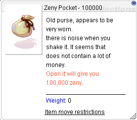 Zeny Pockets are items that, when used, will add the specified amount of Zeny to the player's character.